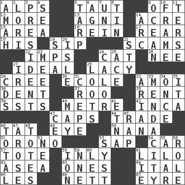 ACROSS 1. High mountains 5. Drawn tight 9. Often (poetically) 12. Greater amount 13. Hindu god of fire 14. 43,560 square feet 15. Length times width 16. It's straight from the horse's mouth 17. Posterior 18. Part of HMS, perhaps 19. Small drink 21. Fraudulent business schemes 22. Naughty children 24. Feline 26. Born 27. Standard of perfection 28. Made of lace 29. Algonquian 30. Learning spot: Fr. 32. Mine, in Marseilles 36. Scratch 37. Friend of Pooh 38. Monthly bill 39. Fast planes 40. Distance measurement (Brit.) 42. South American Indian 43. Smile enhancers 44. Exchange 46. Make lace 49. Sight organ 50. Nanny 51. U. of Maine site 53. Plant excrement 54. Automobile 57. Carry 58. Inwardly 61. _ and Stitch 62. At sea 63. Singles 64. Slanted text style (abbr.) 65. French article 66. Remaining after all deductions 67. Jane of fiction DOWN 1. Nursemaid 2. Australian parrot (variant) 3. Elected leader of a country 4. Ocean 5. Canvas cover 6. Personal question 7. Single; one (prefix) 8. Metal container 9. Sea 10. Movie unit 11. Laconic 14. Curve 19. Health resort 20. Capri or Wright 21. Filthy place 23. Confronts 24. Bodily heat indicating an inflammation 25. Adept person 27. Angers 28. Plunders 29. Music discs 31. Streamer paper 32. Believer in; advocate of (suffix) 33. Ananias' fault 34. Single time 35. Call ___ day 40. Can I? 41. Inactive volcano in Sicily 43. Corporate head (abbr.) 45. Strike 46. Add up to 47. Came up 48. Lugs 52. Teachers' org. 53. System (abbr.) 55. Having or resembling wings 56. Hero or heavy, e.g. 58. Electrically charged atom 59. Compass dir. 60. Allow 61. Untruth