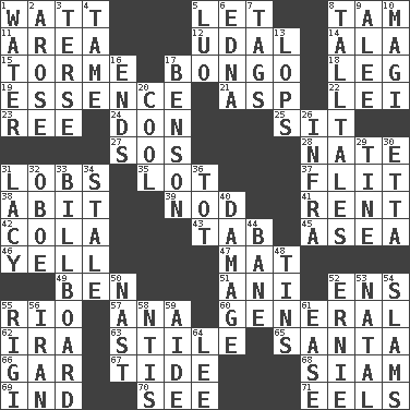 ACROSS 1. Electrical Unit 5. Allow 8. Scottish cap 11. Type of rug 12. Hereditary estate 14. Chicken ___ king 15. Singer Mel 17. Beat drum 18. Part of a journey 19. Gist 21. Cleo's killer 22. Flowery wreath 23. To separate or throw off 24. Spanish title 25. Be seated 27. Distress signal 28. Nathan's nickname 31. Tennis shots 35. Car dealer's back yard 37. Secret move to avoid paying debts 38. "This won't hurt ____!" 39. Lower and raise head in agreement 41. Monthly bill 42. Root beer relative 43. Bar bill 45. At sea 46. Shout 47. Floor protector 49. Benjamin's nick name 51. Black tropical American cuckoo 52. Followers of ems 55. River (Sp.) 57. Santa ___, CA 60. Commissioned military rank 62. Lyricist Gershwin 63. Vertical member of a panel or frame 65. Before Barbara or Clara 66. Slender fish 67. Event that recurs at intervals 68. Thailand, formerly 69. Working for oneself (abbr.) 70. Observe 71. Snakelike fish DOWN 1. Wetness 2. Came up 3. Laconic 4. Not wild 5. Nilotic language 6. Pulitzer Prize-winning author Ferber 7. Labels 8. Baron Munchausen's specialties 9. Toward shelter 10. Wise men 13. Chops off 16. Conclusions 17. Gillaume's butler role 20. Calm and collected 26. Kind of red light 29. Prong on a fork 30. Singer James 31. Made of lace 32. Mitch Miller's instrument 33. Big road sign 34. Lacking originality or spontaneity 36. Small child 40. Break 44. Object of repulsion 48. Airtight sealed metal containers 50. Political cartoonist Thomas 52. Bert's buddy 53. Brizilian seaport 54. Hits or strikes with great force 55. Swiss mountan, "Queen of the Mountains" 56. SW Asia republic 58. Nuclear Threat Initiatives 59. Helper 61. Relaxation 64. Area sheltered from the wind