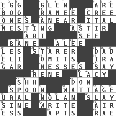 ACROSS 1. Oval reproductive body of a fowl 4. Small, secluded valley 8. "We ___ not amused" (Victoria) 11. Sometimes accompanies a hiss 12. Indian princess (variant) 14. Algonquian 15. Washington bills 17. Approach 18. Slanted text style (abbr.) 19. Inhabiting a nest 21. Moving or stirring 23. Nonscientific branch of learning 24. Observe 25. Object of repulsion 27. Toward shelter 30. French article 31. A viewer who gazes fixedly 34. Male parent 37. Connecticut Ivy Leaguer 38. Leaves out 39. Retirement account (abbr.) 40. Slender fish 41. Makes clutter 43. Declare 44. French philosopher Descartes 45. Made of lace 47. Quiet! 49. Spanish title 50. Soup utensil 52. Electrical Measurement 56. Mountain range 57. Pitcher Ryan 60. Kill 61. Trig term 62. Compose 63. Atmosphere 64. Double-curved letter 65. Tenement units (abbr.) 66. Actress Charlotte DOWN 1. Inky black, to poets 2. Went 3. Leaves 4. Monetary aid 5. Austrian-born American filmmaker Fritz 6. Compass dir. 7. Teachers' org. 8. Nick name for Arthur 9. Posterior 10. Snakelike fish 13. Epoch 14. Quote 16. Comedian Laurel of Laurel & Hardy 20. Angers 22. Compass dir. 25. Actor Lugosi 26. SW Saudi Arabia district 27. Originate 28. Allows 29. Celtic language 30. Part of a journey 32. Heavy book 33. So be it 34. Compact _ 35. Like ___ of sunshine 36. 24 hours 42. Narrow, elongated depression 44. 17th letter of the Greek alphabet 46. Pismires 47. Connects, as a bridge 48. Opening into or through something 49. Natives or inhabitants of Denmark 50. Indian titles of respect 51. Compass dir. 52. Electrical Unit 53. Having or resembling wings 54. Greek goddess of the earth (variant) 55. Jane of fiction 56. Purpose 58. Mouth or opening 59. Mouth edge