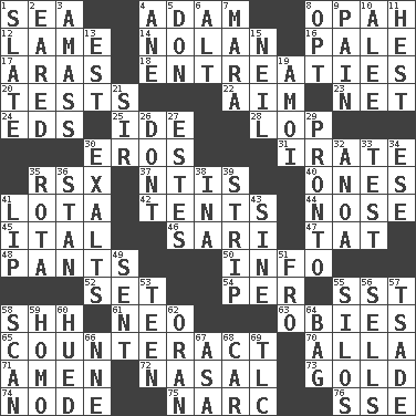 ACROSS 1. Ocean 4. First man 8. Brightly colored fish 12. Unable to walk 14. Pitcher Ryan 16. Light colored 17. Caspian sea tributary 18. Pleas 20. Trials 22. Direct toward a target or goal 23. Fish or hair follower 24. Begley and Asner 25. Binary compound 28. Chop off 30. Greek god of love 31. Feeling or showing extreme anger 35. Acura sports coupe 37. Nuclear Threat Initiatives 40. Washington bills 41. Globular water bottle used in Asia 42. Portable shelters 44. Sense of smell 45. Slanted text style (abbr.) 46. Indian skirt 47. Make lace 48. Leg coverings 50. A message received and understood 52. Arrange properly for use 54. For each 55. Fast jet (abbr.) 58. Quiet! 61. Modern: prefix 63. Off-Broadway awards 65. Frustrate 70. Silent film actress Nazimova 71. So be it 72. Rhinal 73. Gilt 74. Thickened enlargement 75. Drug cop 76. Compass dir. DOWN 1. Schedule 2. Having ears or earlike features 3. Collect or gather 4. A saturated hydrocarbon 5. Spanish title 6. Keyboard modifier key 7. Hindu Mythology: god of death 8. Elect 9. Ache 10. Toward shelter 11. Behest 13. Eastern Standard Time (abbr.) 15. Famous astronaut Armstrong 19. Mine, in Marseilles 21. Title for a knight 26. Do not 27. _____ Park, CO 29. Right away 30. Glorifies 32. Small Philippine buffalo 33. Trial 34. Compass dir. 35. Roll call or roster of names 36. Comedian Laurel of Laurel & Hardy 38. _ tizzy (2 wds.) 39. Long narrow piece of something 41. Mouth edge 43. Trig term 49. Emitted 51. Away 53. Adolescent 55. Grain storage towers 56. Makes a sale 57. Sadhe (variant) 58. Skim 59. Like (prefix) 60. Took on color 62. NW Algerian seaport 64. Container for groceries 66. Compass dir. 67. White ___ sheet 68. 4-wheeled motor vehicle 69. Affectionate concern, for short