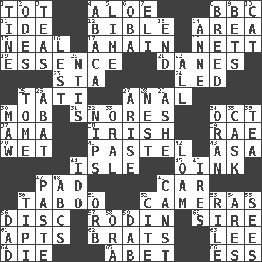 ACROSS 1. Small child 4. Medicinal plant 8. English channel? 11. Binary compound 12. The Good Book 14. Length times width 15. Anneal 17. With great haste 18. Remaining after all deductions 19. Core 21. Natives or inhabitants of Denmark 23. R.R. building 24. Directed 25. Jacques of French films 27. Of or related to the anus 30. Crowd into 31. Sounds asleep 34. Sep. follower 37. Housemaid (var.) 38. From or relating to Ireland 39. Actress Charlotte 40. Soggy 41. Soft color 43. White ___ sheet 44. Small island 45. Pig sound 47. Groovy apt. 49. Automobile 50. Off limits 52. Devices for capturing images 56. Compact _ 57. "The Thinker" sculptor 60. Male parent of an animal 61. Tenement units (abbr.) 62. Naughty children 63. Area sheltered from the wind 64. Expire 65. Collude with 66. Double-curved letter DOWN 1. Prong on a fork 2. Lyric poems 3. Beverages made from leaves 4. Phillipine bananalike plant 5. Welles in "The Third Man" 6. Chief or king in Benin or Nigeria 7. Biblical high priest 8. A special lineage 9. Wagers 10. Domesticated feline 13. Conclusion 14. Singer Murray 16. For fear that 20. Nuclear Threat Initiatives 22. 100% 25. Heavy book 26. Blind as ____ 27. Originate 28. Egg locale 29. American tennis player Robert 30. Informal term for the mouth 32. Pinches, bites 33. Relating to the mouth 34. Northwest Algerian city 35. Keg 36. Afternoon social gathering 42. Rich soil 44. Wedding promise 46. Angers 47. Thick mixture 48. Lettered men learn these first 49. 2nd pers. sing. pres. of can (arch.) 50. Native american tent (variation) 51. Globe 52. Quote 53. Cause heat under the collar 54. Ancient Greek god of war 55. Observes 56. June honoree 58. Mouth or opening 59. Pat or tap gently