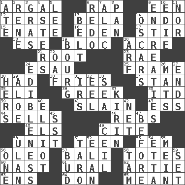 ACROSS 1. Therefore, facetiously 6. Strike 9. Car or cant ending 12. Laconic 13. Actor Lugosi 14. Southwest Nigerian state 15. Maternal 16. Paradise 17. Use a swizzle stick 18. Compass dir. 19. Alliance 20. Land measure 21. Carrot, for example 23. Actress Charlotte 24. He sold his birthright 25. Movie unit 28. Possessed 30. Strips of potato fried in deep fat 34. Comedian Laurel of Laurel & Hardy 35. Connecticut Ivy Leaguer 36. Of Greece 38. It would 39. Loose flowing garment 41. Killed 43. Curvy letter 44. Makes a sale 46. Confederate soldiers (slang) 48. Raised railways 49. Quote 50. A single undivided whole 51. Adolescent 53. Opposite of masc. 56. Butter sub 57. Indonesian resort city 58. Lugs 60. Political cartoonist Thomas 61. Mountain range 62. Nick name for Arthur 63. Followers of ems 64. Spanish title 65. Intended DOWN 1. Had dinner 2. French philosopher Descartes 3. Pate de foie ____ 4. Michaelmas daisies 5. Area sheltered from the wind 6. Make new 7. Actor Baldwin 8. Baking dish 9. Pleas 10. Singer Brickell 11. And not 13. Waist strap 14. Motion picture awards 19. Town 20. Sandy's bark 22. Clumsy lout 24. The property of being fit to eat 26. Floor protectors 27. Conclusions 28. Possessive pronoun 29. Medicinal plant 31. Big collection agency 32. Snakelike fish 33. Ocean 37. Japanese brewing company 40. American author Paul (1891-1958) 42. Fish or hair follower 45. Fast jet (abbr.) 47. Prior to 49. To provide with a ceiling 50. Uhlan (variant) 51. Pacific island yam 52. Style 54. Singer James 55. Count _ (2 wds.) 56. Single 57. Partially opened flower 58. Scottish cap 59. Arrange properly for use