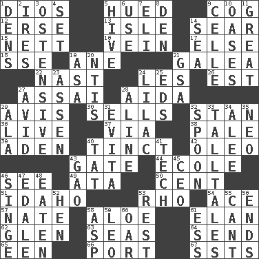 ACROSS 1. "Vaya con ____" 5. Became colored 9. Gear tooth 12. Celtic language 13. Small island 14. Scorch 15. Remaining after all deductions 16. Distinctive style or manner 17. Otherwise 18. Compass dir. 19. A saturated hydrocarbon 21. An organ shaped like a helmet 22. Political cartoonist Thomas 24. French article 26. Eastern Standard Time (abbr.) 27. Slender Brazilian palm 28. Opera by Verdi 29. Advice 30. Exchanges for money 32. Comedian Laurel of Laurel & Hardy 36. Moving, as bait 37. By way of 38. Diluted with white 39. An important port of Yemen 40. Tinged 42. Margarine 43. Yard entry 44. Learning spot: Fr. 46. Perceive with the eye 49. "One Day ___ Time" 50. Penny 51. Potato state 53. 17th letter of the Greek alphabet 54. Adept person 57. Nathan's nickname 58. _ vera 61. Enthusiasm 62. Small, secluded valley 63. Oceans 64. Post 65. Car or cant ending 66. Left side of a ship or aircraft 67. Fast planes DOWN 1. Cub Scout units 2. Angers 3. Clearly or manifestly demonstrative 4. Put into a specified state 5. Hub of activity 6. Purpose 7. Biblical high priest 8. Lair 9. Cell (Danish) 10. Fertile tracts in a desert 11. Relatively large 14. Ocean 19. White ___ sheet 20. Nuclear Threat Initiatives 21. Girls' org. (abbr.) 23. NE Netherlands city 24. Pale purple color 25. Begley and Asner 27. Enthusiastic 28. Place in a line 29. Chicken ___ king 31. Webber/Rice musical 32. Soup utensil 33. Baron Munchausen's specialties 34. Toward shelter 35. Modern: prefix 40. Make lace 41. Technician 43. E Mali city 45. Corporate head (abbr.) 46. Burn superficially 47. Peak District village in England 48. Ingested 52. Layer 53. Respite 55. Patter 56. Extremities 58. Cleo's killer 59. Lion 60. Boat paddle 61. Double-curved letter