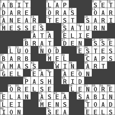 ACROSS 1. "This won't hurt ____!" 5. Infant locale 8. Put into a specified state 11. Have the gumption 12. Mouths or openings 14. Boat paddle 15. Approach 17. Trial 18. Indian skirt 19. Makes clutter 21. Titan orbits this 23. "One Day ___ Time" 25. Writer Wiesel 26. Naughty child 27. Lair 28. Compass dir. 31. Nilotic language 33. Allow head to fall sleepily 35. _____ Park, CO 37. Sharp remark 38. Cartoonist voice _ Blanc 40. Smile enhancers 41. Collect or gather 43. Acquire through effort 45. Tate display 46. Set 47. Ingest 50. Age 52. Romantic infatuation 53. To free from 54. Threatening words 56. Poe poem 61. Style 62. At sea 65. Unit of acoustic absorption 66. Flowery wreath 67. Not women's 68. Frog relative 69. Electrically charged atom 70. Ocean 71. Snakelike fish DOWN 1. First man 2. Object of repulsion 3. Angers 4. Afternoon social gatherings 5. Car dealer's back yard 6. "We ___ not amused" (Victoria) 7. Went by 8. Fly high 9. Merit 10. Three (prefix) 13. Having lost freshness 16. Posterior 18. Institute legal proceedings 20. Comedian Laurel of Laurel & Hardy 22. Prong on a fork 24. Smallest unit of an element 26. Moves up and down 28. Play the lead 29. Back-to-school mo. 30. Curvy letter 31. Unable to walk 32. Mountain range 34. Morning condensation 36. Examine minutely or intensely 37. Container for groceries 39. One who doesn't tell the truth 42. Lick closed 44. Famous astronaut Armstrong 48. Indian state 49. College papers 51. Lyric poems 52. Animal enclosure 54. Margarine 55. Water falling in drops from the sky 57. Nathan's nickname 58. Mitch Miller's instrument 59. Monetary unit of Yemen 60. Extremities 61. Connecticut Ivy Leaguer 63. Compass dir. 64. White ___ sheet