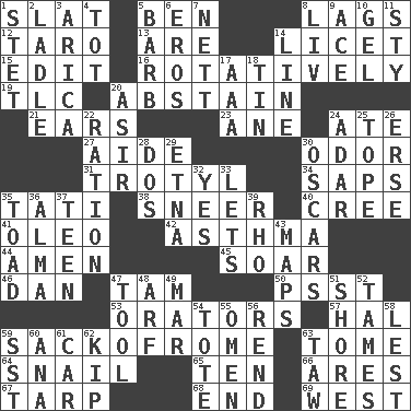ACROSS 1. Narrow board 5. Benjamin's nick name 8. Fails to keep up a pace 12. Edible starchy tuberous root 13. "We ___ not amused" (Victoria) 14. It is permitted: Lat. 15. Prepare for publication 16. Producing rotation 19. Affectionate concern, for short 20. Choose not to consume 21. Hearing organs 23. One (Scot) 24. Had dinner 27. Helper 30. Scent 31. Trinitrotoluene 34. Plant excrements 35. Jacques of French films 38. Contemptuous expression 40. Algonquian 41. Margarine 42. Respiratory problem 44. So be it 45. Fly high 46. Daniel's nick name 47. Scottish cap 50. Inconspicuous attention getter 53. Speakers 57. Actor Linden 59. Italian handbag shop? 63. Heavy book 64. Slow-paced one 65. "___ Little Indians" 66. Ancient Greek god of war 67. Canvas cover 68. Conclude 69. 270 degrees DOWN 1. Proofreading order 2. Dipping utensil 3. N. Chile seaport 4. Small child 5. Sharp remark 6. Greek god of love 7. Remaining after all deductions 8. 54 in ancient Rome 9. Adept person 10. Set 11. Filthy place 14. Actor's bit 17. Auto club (abbr.) 18. Metal container 20. SW Saudi Arabia district 22. Food allowance for one day 24. The sixth month of the Jewish calendar 25. Drink excessively 26. Celtic language 28. Two (Sp.) 29. Inactive volcano in Sicily 30. Motion picture awards 32. It is so 33. Allows 35. Frog relative 36. _ mater 37. Adolescent 39. 17th letter of the Greek alphabet 43. Atlas contents 47. Implement 48. Sandy's bark 49. Third mo. 51. Dinah or Pauly 52. Domesticates 54. Haul 55. Presage 56. Tear apart 58. For fear that 59. Fast jet (abbr.) 60. Santa ___, CA 61. 4-wheeled motor vehicle 62. Monetary unit of Laos 63. The 23rd letter of the Hebrew alphabet