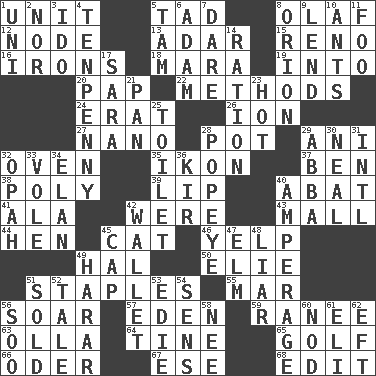 ACROSS 1. A single undivided whole 5. Bit 8. Norwegian king 12. Connecting point 13. The sixth month of the Jewish calendar 15. Western Nevada city 16. Removes the wrinkles 18. Hindu Mythology: god of death 19. To the inside or interior of 20. Infant food 22. Modes 24. Part of Q.E.F. 26. Electrically charged atom 27. Billionth: prefix 28. Cooking vessel 29. Cuckoo 32. Baking chamber 35. Picture 37. Benjamin's nick name 38. More than one (prefix) 39. Mouth edge 40. Blind as ____ 41. Wing 42. Past tense of be (plural) 43. Shopping center 44. Layer 45. Feline 46. Sharp bark 49. Actor Linden 50. Writer Wiesel 51. Paper fasteners 55. Impair 56. Fly high 57. Genesis locale 59. Indian princess (variant) 63. Rounded earthenware pot or jar 64. Prong on a fork 65. _ course 66. Baltic tributary 67. Compass dir. 68. Prepare for publication DOWN 1. Single; one (prefix) 2. And not 3. Wedding promise 4. 3-inch nail 5. Scottish cap 6. First of billions? 7. Have the gumption 8. Greek mythologigal hunter 9. Grant temporary use of 10. Pismires 11. Egg _ yung 14. Food allowance for one day 17. "Two Mules for Sister ____" 21. Baking dish 23. Being at a high temperature 25. Bathroom 28. Wimpy's pal 29. Swedish rock group 30. Anneal 31. International (abbr.) 32. Brightly colored fish 33. Grand slam 34. Enthusiasm 36. Apertif with cassis 40. Electrical Measurement 42. Place for singles 45. Head covering 47. Shade tree 48. One who doesn't tell the truth 49. Ethiopian city, capital of Harari 51. Exchanged or delivered for money 52. Lie 53. Singer Brickell 54. Elected reps. 56. "Barney Miller" actor Jack 58. Born 60. Allow head to fall sleepily 61. Connecticut Ivy Leaguer 62. Bank Draft (abbr.)