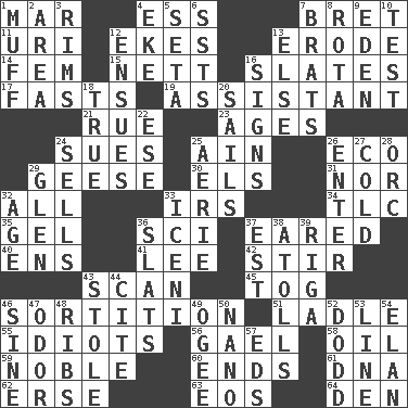 ACROSS 1. Impair 4. Curvy letter 7. Cy Young winner Saberhagen 11. RI univ. 12. Supplements with great effort 13. Wear away 14. Opposite of masc. 15. Remaining after all deductions 16. Chalkboards 17. Goes without food and/or water 19. Helper 21. Regret 23. Eras 24. Institutes legal proceedings 25. The 18th letter of the Arabic alphabet 26. Environmental prefix 29. Honkers 30. Raised railways 31. Not either 32. Everything 33. Big collection agency 34. Affectionate concern, for short 35. Set 36. _-fi 37. Having ears or earlike features 40. Followers of ems 41. Area sheltered from the wind 42. Agitate 43. Examine minutely or intensely 45. Coat; cloak 46. Making a chance decision by using lots 51. Dipping utensil 55. Foolish or stupid persons 56. Highlander 58. Lubricate 59. Impressive in appearance 60. Conclusions 61. Heredity factor (abbr.) 62. Celtic language 63. Greek goddess of the dawn 64. Lair DOWN 1. Perform or handle clumsily 2. Type of rug 3. Basketball hoops 4. Make supply last 5. Stalk of a moss capsule 6. Fast planes 7. Naughty children 8. Roll call or roster of names 9. Genesis locale 10. Trial 12. Follows as a consequence or result 13. Otherwise 16. Signals 18. Loyal 20. Travel by water 22. Compass dir. 24. Exchanges for money 25. Nest on high 26. Keyboard key 27. Chilled 28. The grampus (Milton) 29. Small, secluded valley 32. Personal question 33. Ancient Celtic tribe of eastern Britain 36. Narrow boards 37. Eastern Standard Time (abbr.) 38. Ringlike coral islands and reefs 39. Capital of Latvia 43. Took without asking 44. Quote 46. Trig term 47. Aroma 48. Teases 49. Double curve, resembling the letter S 50. Billionth: prefix 52. Texas town _ City 53. Actor's bit 54. Liveliness 57. Begley and Asner