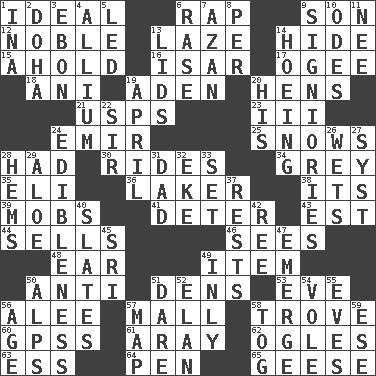 ACROSS 1. Standard of perfection 6. Hit sharply and swiftly 9. Manchild 12. Impressive in appearance 13. Goldbrick 14. Flintstone garb 15. Hold, grip (Informal) 16. Austrian river, tributary to the Danube 17. Double curve, resembling the letter S 18. Cuckoo 19. An important port of Yemen 20. Coop moms 21. United States Postal Service (abbr.) 23. One more than two 24. Independent ruler or chieftain 25. Overwhelms 28. Possessed 30. Amusement-park features 34. Jennifer or Joel 35. Biblical high priest 36. Member of a famous L.A. basketball team 38. ___ a Wonderful Life 39. Disorderly crowds 41. Prevent from occurring 43. Eastern Standard Time (abbr.) 44. Makes a sale 46. Perceives with the eye 48. Hearing organ 49. A distinct part 50. Against 51. Cub Scout units 53. Night before a holiday 56. Toward shelter 57. Promenade 58. Collection of objects 60. Global Positioning Systems (abbr.) 61. Like ___ of sunshine 62. Stares at amorously 63. Double-curved letter 64. Animal enclosure 65. Honkers DOWN 1. _ tizzy (2 wds.) 2. Capital of the state of Qatar 3. Inky black, to poets 4. Plant genus of onion and garlic 5. Directed 6. To erase 7. Muslim summons to prayer 8. For each 9. Seigniories (variant) 10. Lyric poems 11. Born 13. Flaplike coverings 14. Weeding 19. Showery time 20. Part of HMS, perhaps 22. Title for a knight 24. The property of being fit to eat 26. Soaks 27. System (abbr.) 28. Is hesitant and indecisive 29. Medicinal plant 31. June honoree 32. Make supply last 33. Put into a specified state 37. Musical pauses 40. Chalkboards 42. Portuguese money of account (variant) 45. Indian title of respect (Mr.) 47. Develop 49. Inwardly 50. High mountains 51. Have the gumption 52. Style 54. Grand slam 55. Nights before holidays 56. Personal question 57. Atlas unit 58. Coat; cloak 59. Compass dir.
