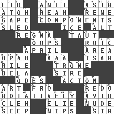 ACROSS 1. Flaplike covering 4. Opposed to 8. SW Saudi Arabia district 12. Tiny particle 14. 480, 500 or 516 sheets of paper 15. French philosopher Descartes 16. Stare wonderingly 17. Parts 20. Downhill vehicle 21. Frozen water 22. Keyboard modifier key 23. Canadian anthropologist Darnell 27. Drawn tight 29. I made a mistake 31. College mil. group 34. Showery time 35. Length times width 36. Brightly colored fish 39. Auto club (abbr.) 41. Russian ruler of old 42. Cause heat under the collar 43. Heavy duty weighing machine 46. Actor Lugosi 47. Father 48. Lyric poems 51. NE Massachussets city 54. Tate display 56. From 58. Make new 61. Happening in regular succession 66. Enthusiastic 67. To starve (Brit.) 68. Writer Wiesel 69. Unadorned 70. Ooze 71. Pinches, bites 72. Title for a knight DOWN 1. Straggles 2. Slanted text style (abbr.) 3. Drug addict 4. Curve 5. Modern: prefix 6. Scottish cap 7. Body of Kaffir warriors 8. "We ___ not amused" (Victoria) 9. Legislators 10. International (abbr.) 11. Respite 13. Ancient Persian 18. Sep. follower 19. Teachers' org. 24. Republican Party 25. Not either 26. Capital of Western Samoa 28. A salt of uric acid 30. Narrow boards 32. Afternoon social gathering 33. 4-wheeled motor vehicle 34. At or in the front 36. Globe 37. Sliced dessert 38. One to whom something is allotted 40. Operatic vocal solo 44. The grampus (Milton) 45. Fish or hair follower 49. Newt 50. Indian title of respect (Mr.) 52. NW Algerian seaport 53. Congenital growth or mark on the skin 54. Curves 55. Hero or heavy, e.g. 57. Baking chamber 59. "You Light Up My Life" star Conn 60. Baltic tributary 62. Electrical Unit 63. Biblical high priest 64. Mouth edge 65. It is so