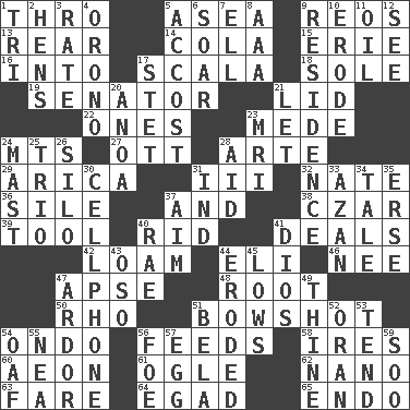 ACROSS 1. Through, poetically 5. At sea 9. Vintage cars 13. Located in or toward the back 14. Root beer relative 15. One of the Great Lakes 16. To the inside or interior of 17. Any of the three canals of the cochlea 18. Not divided or shared with others 19. Elected representative 21. Hat (slang) 22. Washington bills 23. Ancient Persian 24. Mountains (abbr.) 27. Baseball player Mel 28. Johnson of "Laugh-In" 29. N. Chile seaport 31. One more than two 32. Nathan's nickname 36. Drop; flow; fall 37. Also 38. Russian ruler of old 39. Utensil 40. To free from 41. Allots cards 42. Rich soil 44. Connecticut Ivy Leaguer 46. Born 47. Domed church section 48. Carrot, for example 50. 17th letter of the Greek alphabet 51. The distance a bow sends an arrow 54. Southwest Nigerian state 56. Eats 58. Angers 60. Period of immesurable duration 61. Stare 62. Billionth: prefix 63. Conductor's collection 64. Mild oath 65. Inside; within (prefix) DOWN 1. Three (prefix) 2. Coop moms 3. Assign a rank or rating to 4. U. of Maine site 5. Buttonhole 6. Fly high 7. Pipe bend 8. American Automobile Association (abbr.) 9. Dwelling 10. Wear away 11. Petroleum 12. Observe 17. Proofreading order 20. Small Philippine buffalo 21. Allow 23. Medical imaging device (abbr.) 24. Vertical spar for supporting sails 25. Musical group of three 26. Grain storage tower 28. Assist 30. Portable communications device 31. Indiana (abbr.) 33. Muslim summons to prayer 34. Lie 35. Celtic language 37. Direct toward a target or goal 40. Actress Charlotte 41. "Vaya con ____" 43. Bear (Spanish) 44. Eaten away 45. Coldest temperatures 47. Zeal 49. One or ones belonging to thee 51. Actor Lugosi 52. NW Algerian seaport 53. Be inclined (to) 54. Clumsy lout 55. Teachers' org. 56. Enemy 57. Ovum 59. "Barney Miller" actor Jack