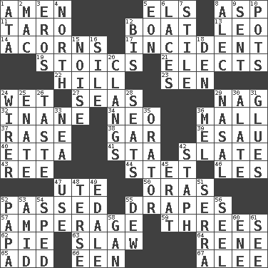 ACROSS 1. So be it 5. Raised railways 8. Cleo's killer 11. Pacific island yam 12. Water vessel 13. Lion 14. Oak nuts 17. Happening 19. Unemotional ones 21. Chooses 22. Land elevation 23. Elected rep. 24. Soggy 27. Oceans 29. Tired old horse 32. Lacking in sense or substance 34. Modern: prefix 36. Promenade 37. Raze (variant) 38. Slender fish 39. He sold his birthright 40. Singer James 41. R.R. building 42. Chalkboard 43. Portuguese money of account (variant) 44. Proofreading order 46. French article 47. Shoshoni 50. Mouths or openings 52. Went by 55. Window treatments 57. Electrical Measurement 59. Trios 62. Sliced dessert 63. Cole _ (cabbage dish) 64. French philosopher Descartes 65. Say or write further 66. Car or cant ending 67. Toward shelter DOWN 1. _ moment's notice (2 wds.) 2. Apple computer (short form) 3. Greek god of love 4. 0 degrees 5. A really long time 6. Shoestrings 7. Vertical member of a panel or frame 8. Actor Baldwin 9. Transmitted 10. Plant holders 12. Altar cloth linen 15. Annoying sound 16. Drop; flow; fall 18. Lair 20. Rigngs loudly 24. One who wires 25. Maternal 26. Clothes sense 28. Theater features 29. Rhinal 30. Having winglike extensions 31. Cements 33. Teachers' org. 35. Speaker 36. Cartoonist voice _ Blanc 42. Staphylococcus 45. Part of Q.E.F. 47. Purpose 48. Laconic 49. Peak District village in England 51. Father Junipero _ 52. Dad 53. Among 54. Hurried 55. Morning condensation 56. Stitch closed the eyes of (a falcon) 58. Separate the seeds from cotton 60. Compass dir. 61. Observe