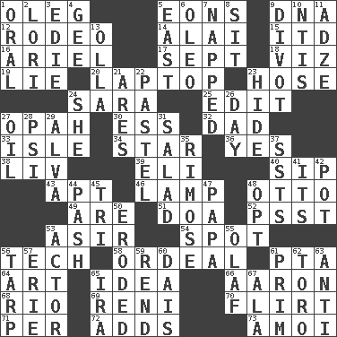 ACROSS 1. Cassini of fashion 5. Immeasurably long periods of time 9. Heredity factor (abbr.) 12. Cowboy competition 14. Jai _ 15. It would 16. Satellite of Uranus 17. Back-to-school mo. 18. Namely 19. Whopper 20. Portable computer 23. Stockings 24. "Two Mules for Sister ____" 25. Prepare for publication 27. Brightly colored fish 30. Double-curved letter 32. June honoree 33. Capri or Wright 34. Play the lead 36. Affirmative reply 38. 54 in ancient Rome 39. Connecticut Ivy Leaguer 40. Small drink 43. Fitting 46. Desk light 48. Von Bismarck 49. "We ___ not amused" (Victoria) 51. ___ good deed 52. Inconspicuous attention getter 53. SW Saudi Arabia district 54. Specific locale 56. Technical 58. Severe or trying experience 61. Parent Teacher Association (abbr.) 64. Nonscientific branch of learning 65. The content of cognition 66. Composer Copland 68. River (Sp.) 69. Painter Guido (1575-1642) 70. Seductive woman who exploits men 71. For each 72. Does sums 73. Mine, in Marseilles DOWN 1. Of the mouth 2. Australian parrot (variant) 3. Singer Brickell 4. Turn to the right 5. Compass direction 6. Margarine 7. Slept 8. Be seated 9. A piece of turf (Scot.) 10. Nuclear Threat Initiatives 11. Edge tool used to cut and shape wood 13. Water jar 21. Ancient Greek god of war 22. Soft color 23. Flintstone garb 24. A female animal or person 26. 24 hours 27. Petroleum 28. Air pressure measure (abbr.) 29. Inventor's middle name 31. First course 35. Full of chinks, cracks, or crevices 37. Fast planes 41. ___ a Wonderful Life 42. Plant holder 44. Romantic infatuation 45. Three (prefix) 47. Dad 48. Choose 50. Eaten away 53. Thespian 55. Norwegian king 56. Canvas cover 57. One of the Great Lakes 59. Tear apart 60. Raised platform 61. Demure 62. "Corrida" creature 63. Opposed to 65. Lyricist Gershwin 67. Chicken ___ king