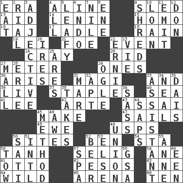 ACROSS 1. Epoch 4. Place in a line 9. Downhill vehicle 13. Help 14. Soviet premier 1918-24 15. Same (prefix) 16. _ Mahal 17. Dipping utensil 18. Water falling in drops from the sky 19. Flowery wreath 21. Enemy 22. Happening 24. Supercomputer manufacturer 26. To free from 27. Distance measurement 29. Washington bills 30. Get up 31. Wise men 33. Also 36. 54 in ancient Rome 37. Paper fasteners 40. Ocean 41. Area sheltered from the wind 42. Johnson of "Laugh-In" 43. Slender Brazilian palm 45. Create 47. Moves on water 48. She-sheep 49. United States Postal Service (abbr.) 50. Locates 52. Benjamin's nick name 54. R.R. building 56. Hyperbolic tangent 57. Former Milwaukee Brewers owner Bud 59. One (Scot) 61. "Beetle Bailey" pooch 62. Mexican monetary units 63. Compass dir. 64. Rampant 65. Sports stadium 66. "___ Little Indians" DOWN 1. Consume 2. Monetary unit of Yemen 3. Descriptive word 4. 100% 5. Like summer trees 6. _ china 7. "Death on the ____" 8. Compass dir. 9. Fragments 10. Grant temporary use of 11. Give off 12. Spanish title 20. Angers 22. Bert's buddy 23. Compete 25. Ancient Greek god of war 27. Promenade 28. 4th largest of the Great Lakes 29. Stare 31. Female horse 32. Fitting 33. Aide 34. Anneal 35. Raised platform 38. Receives possession of 39. Backtalk 44. Plant excrements 45. Mode 46. Deep reverence 49. The state of being joined or united 50. Suttee (variant) 51. International (abbr.) 52. Fermented drink made from hops 53. Otherwise 55. Singer Murray 56. Pull behind 57. Health resort 58. Girls' org. (abbr.) 60. Car or cant ending