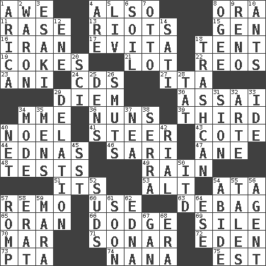 ACROSS 1. Deep reverence 4. In addition 8. Mouth or opening 11. Raze (variant) 13. Debaucheries 15. Commissioned military rank (abbr.) 16. SW Asia republic 17. Webber/Rice musical 18. Portable shelter 19. Popular sodas 21. Car dealer's back yard 22. Vintage cars 23. Cuckoo 24. Music discs 27. Call ___ day 29. South Vietnam president (1954) 30. Slender Brazilian palm 34. Madame (abbr.) 36. Religious women 39. One of three equal parts 40. Christmas carol 41. Navigate 43. ____ d'Azur (French Riviera) 44. Ferber et al. 46. Indian skirt 47. A saturated hydrocarbon 48. Trials 49. Precipitation 51. ___ a Wonderful Life 53. The first octave above the treble staff 54. "One Day ___ Time" 57. San ____ (Riviera town) 60. Purpose 63. Debunk (Brit. slang) 65. Northwest Algerian city 66. Evade 69. Filth; sediment 70. Third mo. 71. Underwater navigation system 72. Genesis locale 73. Parent Teacher Assoc. 74. Nanny 75. Eastern Standard Time (abbr.) DOWN 1. N. Chile seaport 2. Make _____ (do battle with) 3. 1973 Nobel Price Winner (Physics) Leo 4. "We ___ not amused" (Victoria) 5. 54 in ancient Rome 6. The visible part of the earth's surface 7. "Beetle Bailey" pooch 8. Double curve, resembling the letter S 9. Former U.S. Attorney General Janet 10. Pismires 12. Compass dir. 14. Suttee (variant) 18. File 13 20. _-fi 25. Lairs 26. Particles of soot 28. Make lace 29. Accusation by an informer 31. The Jewish people; Israel 32. Johnson of "Laugh-In" 33. Binary compound 34. Method 35. Not women's 37. Teachers' org. 38. Spanish missionary in California 40. Fish or hair follower 42. Monetary unit of Yemen 45. Fast jet (abbr.) 50. It would 52. Soap bubbles 54. Stay 55. Falsehoods 56. Rep 57. Frolic 58. Part of Q.E.F. 59. Hindu Mythology: god of death 61. Within a short period 62. Pulitzer Prize-winning author Ferber 64. Compass dir. 67. Separate the seeds from cotton 68. Epoch