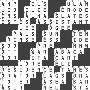 ACROSS 1. Electrical Unit 4. Raised railways 7. ____ Bator, Mongolia 11. Lion 12. Writer Wiesel 13. Wear away 14. Followers of ems 15. _ mater 16. Chalkboards 17. _____ Park, CO 19. Aide 21. Area sheltered from the wind 23. Double curve, resembling the letter S 24. Friends 25. Player for Phoenix 26. Nine, plus one 29. Remove soap 30. Double-curved letter 31. Binary compound 32. "Barney Miller" actor Jack 33. Before (prefix) 34. Compass dir. 35. Baseball player Mel 36. Armed conflict 37. Phillipine bananalike plant 40. And not 41. Call ___ day 42. Haul 43. Old wives' tales, e.g. 45. Biblical high priest 46. Dwelling 51. Corrects by punishment or discipline 55. Speaker 56. Falls behind 58. Mouth or opening 59. Carrier 60. Toward the sea 61. Long, evenly shaped piece 62. SW Saudi Arabia district 63. Cartoonist voice _ Blanc 64. R.R. building DOWN 1. Toward shelter 2. Not women's 3. Mail 4. Pipe bend 5. Pale green bean 6. Oceans 7. A salt of uric acid 8. Globular water bottle used in Asia 9. Arabian gulf 10. A home for chicks 12. Artist's stands 13. Otherwise 16. Attaches a signature 18. Flair 20. Boozer 22. Compass dir. 24. Peter (Polish) 25. Spanish missionary in California 26. Colored lightly or faintly 27. Pulitzer Prize-winning author Ferber 28. ___ Haven, CT 29. Printing process, for short 32. Manchild 33. Eucharist need 36. One who wires 37. Adept person 38. Greek mezzo-soprano Agnes 39. Roberta Peters solo 43. 61 cubic inches 44. Aroma 46. Round or rotation of duties 47. Greek god of love 48. Suttee (variant) 49. Burrowing marine mollusk 50. Relaxation 52. Disorderly crowds 53. Part of Q.E.F. 54. "Two Mules for Sister ____" 57. Set