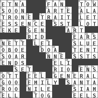 ACROSS 1. Inactive volcano in Sicily 5. Avid follower 8. Pull behind 11. Within a short period 12. Johnson of "Laugh-In" 14. Insect wing 15. Heavy duty weighing machine 17. Distinguishing feature 18. Allow 19. Center 21. Fast jet (abbr.) 22. Car dealer's back yard 23. Supplement with great effort 24. Commissioned military rank (abbr.) 25. Nonscientific branch of learning 27. To free from 28. Hearing organs 31. Remaining after all deductions 35. Luau accessory 37. Turn sharply 38. Mitch Miller's instrument 39. ___ good deed 41. Portable shelter 42. Fly high 43. Compass dir. 45. Fast planes 46. Conclusions 47. Connecticut Ivy Leaguer 49. Put into a specified state 51. _ de Janeiro 52. Followers of ems 55. Baseball player Mel 57. Snakelike fish 60. Commissioned military rank 62. Thick or sticky substance 63. Poet Dickinson 65. Before Barbara or Clara 66. Friend of Pooh 67. The longest river in the world 68. Thailand, formerly 69. Pipe bend 70. Coat; cloak 71. Snakelike fish DOWN 1. First name in cosmetics 2. Cod relative 3. Trap for birds or small mammals 4. Queen of England 1702-14 5. At a great distance 6. Ancient river in northeast Turkey 7. Nuclear Threat Initiatives 8. Baron Munchausen's specialties 9. Margarine 10. Electrical Unit 13. Singer James 16. Engineer (abbr.) 17. Watched over 20. To provide with a ceiling 26. Musical pauses 29. Undersized animal 30. Puts into a specified state 31. Characteristic smell of wine 32. Inky black, to poets 33. Inedible or poisonous agaric 34. Laconic 36. Electrically charged atom 40. Disorder of the immune system 44. Writer Wiesel 48. Charged particles 50. Adolescent 52. Bert's buddy 53. Relating to or accompanying birth 54. Criticizes harshly 55. Legendary monster 56. Instrument 58. Send forth 59. _ and Stitch 61. Comfort 64. Part of a journey