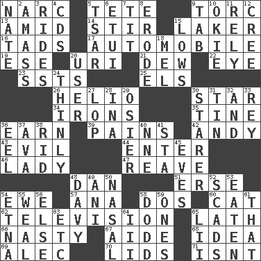 ACROSS 1. Drug cop 5. False hair 9. Torque (variant) 13. Among 14. Move through with a circular motion 15. Member of a famous L.A. basketball team 16. Bits 17. Car 19. Compass dir. 20. RI univ. 21. Morning condensation 22. Sight organ 23. Fast planes 25. Raised railways 26. Sun: prefix 30. Play the lead 34. Metal shackles 35. Prong on a fork 36. Merit 39. Aches 42. "60 Minutes" Commentator Rooney 43. Morally bad or wrong 44. Keyboard key 46. Kenny Rogers chart-topper in '80 47. Rob, plunder, or pillage 48. One of the 12 tribes of Israel 51. Celtic language 54. She-sheep 57. Santa ___, CA 58. Two (Sp.) 60. Feline 62. Household entertainment appliance 65. Thin strip of wood or metal 66. Characterized by obscenity 67. Helper 68. The content of cognition 69. Actor Baldwin 70. Hats (slang) 71. Is not DOWN 1. Nathan's nickname 2. Collect or gather 3. Amusement-park features 4. Music discs 5. Russian ruler of old 6. Needle holder 7. Teat (slang) 8. Eat (away) 9. Bar bill 10. Migrant worker of the '30s 11. Trust 12. Algonquian 15. Coldest temperatures 18. Cartoonist voice _ Blanc 20. One who uses or employs something 24. Without viscosity 27. Trim (branches) 28. _ tizzy (2 wds.) 29. Flexible twig of a willow tree 30. A viewer who gazes fixedly 31. Metal container 32. Plus 33. Marina Del _, California 36. Snakelike fish 37. Actress Gardner 38. To free from 40. Compass dir. 41. R.R. building 45. Nights before holidays 48. _ Jones' Locker 49. Black tropical American cuckoo 50. Rhinal 52. Heaps 53. Ingested 54. Inactive volcano in Sicily 55. Welt 56. Otherwise 58. Texas town _ City 59. Singles 61. Not this but _ 63. And so on (abbr.) 64. One more than two 65. Cards in a Roman deck?