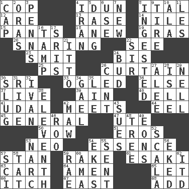 ACROSS 1. Police officer (slang) 4. Goddess of spring and wife of Bragi 8. Slanted text style (abbr.) 12. "We ___ not amused" (Victoria) 13. To erase 14. Mediterranean tributary 15. Leg coverings 18. Afresh 19. Pate de foie ____ 20. Catching in a trap 22. Observe 23. Stricken, poetically 24. Altar cloth linen 25. Pacific Standard Time (abbr.) 26. Window treatment 30. Indian title of respect (Mr.) 33. Stared 36. Otherwise 37. Moving, as bait 39. The 18th letter of the Arabic alphabet 40. Small valley 41. Hereditary estate 42. Confronts 44. Snakelike fish 45. Commissioned military rank 47. Shoshoni 50. Promise 51. Greek god of love 53. Modern: prefix 54. Gist 57. Comedian Laurel of Laurel & Hardy 59. Libertine 61. 1973 Nobel Price Winner (Physics) Leo 63. Haul 64. So be it 65. Allow 66. Hankering 67. 90 degrees 68. Find the sum of DOWN 1. Head covering 2. Mouths or openings 3. Actor Sean's family 4. SW Asia republic 5. Mild oath, euphamism for damn 6. Purpose 7. ___ Haven, CT 8. Swallowed 9. Become fatigued 10. Wing 11. French article 16. Pack (down) 17. Indian titles of respect 21. "Tell ____ the Marines!" 22. Title for a knight 24. Partially opened flower 26. Penny 27. Toward shelter 28. Small island 29. 1994 drama film starring Jodie Foster 30. Snaillike creature with no shell 31. Travel on or in a vehicle 32. "Terrible" tsar 34. Highlander 35. Whopper 38. Veterans Day date 42. Opening into something insatiable 43. Institutes legal proceedings 46. Friend of Pooh 48. Relationship diagram 49. Immeasurably long periods of time 52. Any of the three canals of the cochlea 53. Drug cop 54. Makes supply last 55. Posted 56. Supplemented with great effort 57. _-fi 58. Make lace 59. Actress Charlotte 60. Housemaid (var.) 62. It would