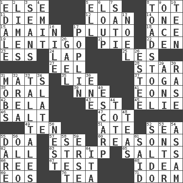 ACROSS 1. Otherwise 5. Raised railways 8. Small child 11. South Vietnam president (1954) 12. Grant temporary use of 14. Single 15. At full speed 17. Mickey's pet 18. Adept person 19. Small, flat, pigmented spot on the skin 21. Sliced dessert 22. Lair 23. Double-curved letter 24. Infant locale 25. French article 27. Snakelike fish 28. Play the lead 31. Floor protectors 35. Whopper 37. Ancient Roman robe 38. Relating to the mouth 39. Compass dir. 41. Immeasurably long periods of time 42. Actor Lugosi 43. Eastern Standard Time (abbr.) 45. Writer Wiesel 46. Table seasoning 47. Small bed 49. "___ Little Indians" 51. Had dinner 52. Ocean 55. ___ good deed 57. Compass dir. 60. Thinks logically 62. 100% 63. Remove all contents or possession from 65. Table seasonings 66. To riddle 67. Trial 68. It may be bright or harebrained 69. Greek goddess of the dawn 70. Afternoon social gathering 71. Dormintory (informal) DOWN 1. Peak District village in England 2. Citrus fruits 3. Seines 4. Send forth 5. Pipe bend 6. Central Nebraska county 7. Suttee (variant) 8. Inedible or poisonous agaric 9. At one time in the past 10. Adolescent 13. Christmas carol 16. "Death on the ____" 17. Cotton for raincoats, e.g. 20. Highlander 26. First name in cosmetics 29. Hindu god of fire 30. Raze (variant) 31. Disorderly crowds 32. Length times width 33. Baron Munchausen's specialties 34. Chalkboard 36. Compass dir. 40. Fortification 44. Carry 48. Afternoon social gatherings 50. Egg locale 52. Twentieth part of a lira 53. Keyboard key 54. Indian state 55. Have the gumption 56. Margarine 58. Proofreading order 59. Celtic language 61. Stated 64. Call ___ day