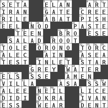 ACROSS 1. Bristle 5. Style 9. Nonscientific branch of learning 12. SW Asia republic 13. Yard entry 14. Algonquian 15. Cause heat under the collar 16. Blind as ____ 17. Expression of disdain 18. Snakelike fish 19. Dreamland 21. Thick mixture 22. Adolescent 24. Sis' sibling 26. Compass dir. 27. First course 28. Carrot, for example 29. Lacquered or enameled metalware 30. U. of Maine site 32. Torque (variant) 36. Actor Baldwin 37. The 18th letter of the Arabic alphabet 38. Toward the sea 39. Trial 40. An arm off of a larger body of water 42. Play the lead 43. Jennifer or Joel 44. Wetness 46. Raised railways 49. Compass dir. 50. So be it 51. Country residence 53. White ___ sheet 54. Compass dir. 57. Toward shelter 58. Famous astronaut Armstrong 61. Louse (plural) 62. "You Light Up My Life" star Conn 63. Gumbo ingredient 64. "Terrible" tsar 65. Curvy letter 66. Put on (as clothing) 67. Scratch DOWN 1. Title for a man of rank and authority 2. One of the Great Lakes 3. Baron Munchausen's specialties 4. A saturated hydrocarbon 5. Mild oath 6. Experiment locale 7. _ moment's notice (2 wds.) 8. Fish or hair follower 9. Ascend 10. Musical pauses 11. Giggle 14. Accounting whiz (abbr.) 19. Teachers' org. 20. Southwest Nigerian state 21. Cooking vessel 23. Choose 24. Maid-servant 25. Friend of Pooh 27. Not divided or shared with others 28. Turbulent 29. Make lace 31. Indian princess (variant) 32. Clothes sense 33. Clearly or manifestly demonstrative 34. Bring up, as a child 35. 4-wheeled motor vehicle 40. Big collection agency 41. It was, poetically 43. Girls' org. (abbr.) 45. Nursemaid (var.) 46. Elude 47. Ms. Damita and namesakes 48. Bobsleighs 52. Flowery wreath 53. Having or resembling wings 55. Examine hastily 56. Left 58. At this time 59. Make supply last 60. Retirement account (abbr.) 61. Hat (slang)