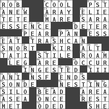 ACROSS 1. Director Reiner 4. Calm and collected 8. Pacific Standard Time (abbr.) 11. Afresh 13. Like ___ of sunshine 14. Writer Wiesel 15. False hair 16. Female horse 17. "Two Mules for Sister ____" 18. Center 21. Prevent from occurring 22. Lightbulb-shaped fruit 23. Baking dish 25. Curvy letter 26. Ingest 29. File 13 32. Derisive sound 34. Apertif with cassis 35. The first octave above the treble staff 38. Jacques of French films 39. Vertical member of a panel or frame 41. Wander 43. Part of a journey 44. "We ___ not amused" (Victoria) 45. Come to pass 46. Consumed 50. One more than two 51. Cuckoo 54. Overdraft (abbr.) 55. Conclusions 57. Message 59. Inhabiting a nest 63. Grain storage tower 64. Necklace unit 67. Length times width 68. At sea 69. Single time 70. Repose 71. Was introduced to 72. Wrote a lyric poem 73. A female animal or person DOWN 1. Assign a rank or rating to 2. Singles 3. Antes 4. Device for capturing images 5. Mouth or opening 6. Rowing implement 7. Potassium hydroxide 8. Food holder 9. Begets 10. Lacerates 12. Shed a tear 14. Compass dir. 19. Remaining after all deductions 20. Automobile 21. Heredity factor (abbr.) 23. Silvers or Donahue 24. Measure of real estate 26. Eastern Standard Time (abbr.) 27. Of or related to the anus 28. Carryall 30. Atmospheres 31. Drug cop 33. Swiss mountan, "Queen of the Mountains" 36. Venues 37. "Change" in Tahitian 39. Droops 40. Not kosher 42. Medical imaging device (abbr.) 45. Probability 47. Compass dir. 48. Looked after 49. Compass dir. 51. Indian state 52. Annoying sound 53. An arm off of a larger body of water 56. Play the lead 58. ___ good deed 60. Angers 61. Tender 62. Yard entry 64. Sometimes accompanies a hiss 65. Conclusion 66. Adept person