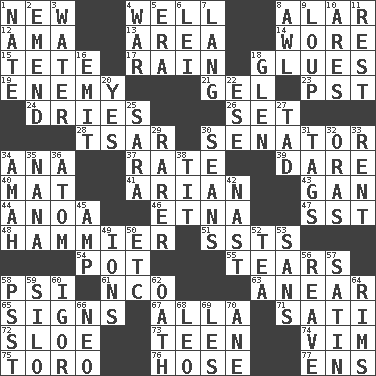 ACROSS 1. ___ Haven, CT 4. Water source 8. Having or resembling wings 12. Wet nurse (var.) 13. Length times width 14. Had on 15. Wig 17. Water falling in drops from the sky 18. Adhesives 19. Foe 21. Set 23. Pacific Standard Time (abbr.) 24. Frees from moisture 26. Arrange properly for use 28. Russian ruler of old 30. Elected representative 34. Santa ___, CA 37. Assign a rank or rating to 39. Have the gumption 40. Floor protector 41. Believer in; advocate of (suffix) 43. Separate the seeds from cotton 44. Small Philippine buffalo 46. Inactive volcano in Sicily 47. Fast jet (abbr.) 48. More overdramatic by comparison 51. Fast planes 54. Plant holder 55. Rends 58. Air pressure measure (abbr.) 61. Non-commissioned officer (abbr.) 63. Approach 65. Attaches a signature 67. Silent film actress Nazimova 71. Suttee (variant) 72. A type of plum 73. Adolescent 74. Zeal 75. "Corrida" creature 76. Stockings 77. Followers of ems DOWN 1. Nathan's nickname 2. Make improvements or corrections to 3. Wetness 4. Armed conflict 5. Period 6. Flowery wreath 7. Long (Scottish) 8. Leather borer 9. Central Nebraska county 10. Ancient Greek god of war 11. Respite 16. Give off 18. Small, secluded valley 20. Affirmative reply 22. Compass dir. 25. "Two Mules for Sister ____" 27. Bit 29. More uncommon 30. Seines 31. Labels 32. Mouths or openings 33. Monthly bill 34. Nursemaid 35. Grandmother 36. Tiny particle 38. Teat (slang) 42. Political cartoonist Thomas 45. Electrical Unit 49. Charged atoms 50. And so on (abbr.) 52. Afternoon social gathering 53. Without 56. Rob, plunder, or pillage 57. Smooth fabric 58. Inconspicuous attention getter 59. Grain storage tower 60. Russian composer Stravinsky 62. Pledge 64. Basketball hoops 66. Modern: prefix 68. Lion 69. French article 70. A saturated hydrocarbon