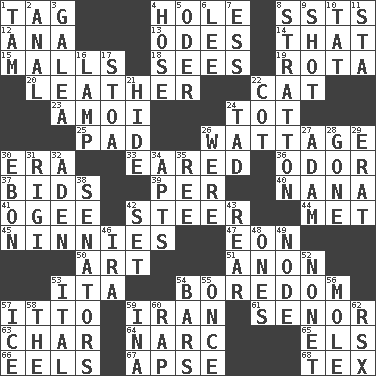 ACROSS 1. Label 4. Opening into or through something 8. Fast planes 12. Santa ___, CA 13. Lyric poems 14. Not this but _ 15. Shopping centers 18. Perceives with the eye 19. Roll call or roster of names 20. Cordwainer's material 22. Feline 23. Mine, in Marseilles 24. Small child 25. Writing tablet 26. Electrical Measurement 30. Period 33. Having ears or earlike features 36. Scent 37. Auction offers 39. For each 40. Nanny 41. Double curve, resembling the letter S 42. Guide 44. Was introduced to 45. Fools 47. A really long time 50. Tate display 51. Soon (poet.) 53. Call ___ day 54. Mood resulting from idleness 57. "Tell ____ the Marines!" 59. SW Asia republic 61. Sir (Sp.) 63. Burn to charcoal 64. Drug cop 65. Raised railways 66. Snakelike fish 67. Domed church section 68. John Ritter's dad DOWN 1. Scottish cap 2. Of or related to the anus 3. An organ shaped like a helmet 4. Stockings 5. Baltic tributary 6. Area sheltered from the wind 7. Double-curved letter 8. Ski resort town in Vermont 9. Attempt 10. Make lace 11. R.R. building 16. Desk light 17. Portico 21. Flintstone garb 22. Small bed 24. Small amount or degree 26. We are 27. First man 28. Went 29. Part of Q.E.F. 30. Inky black, to poets 31. Swiss mountan, "Queen of the Mountains" 32. An important port of Yemen 34. Tenement units (abbr.) 35. To sift 38. Legislators 42. Arrange properly for use 43. Stern 46. Lyricist Gershwin 48. Singles 49. Connecting point 52. Music written for nine 53. Slanted text style (abbr.) 54. Oblong pieces of solid material 55. Single time 56. Undercover agent 57. Frozen water 58. Definite Article 59. _ tizzy (2 wds.) 60. Hit sharply and swiftly 62. Acura sports coupe
