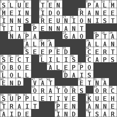 ACROSS 1. Change direction abruptly 5. Nine, plus one 8. Inside of hand 12. Chow _ 13. Wedding promise 14. The wife of a rajah (variant) 15. Restaurants 16. One who advocates reunion 19. Teat (slang) 20. Pre-World Series prize 21. California wine valley 23. E Mali city 24. Parent Teacher Association (abbr.) 27. _ mater 30. ____ Jay Lerner 31. Oozed 34. An absolute certainty 35. Religious group 38. Ms. Damita and namesakes 40. Smile enhancers 41. Mitch Miller's instrument 42. City in Syria 44. Hang loosely or laxly 45. Raised platform 46. Conclusion 47. Large container 50. Inactive volcano in Sicily 53. Speakers 57. The grampus (Milton) 59. Supplementary 63. Malaysian steamed pastry 64. Distinguishing feature 65. Animal enclosure 66. Queen of England 1702-14 67. Assistant 68. Indiana (abbr.) 69. Russian ruler of old DOWN 1. Stricken, poetically 2. Soviet premier 1918-24 3. National forest in Provo, Utah 4. Followers of ems 5. Hoop that covers a wheel 6. Locale of original sin 7. Part of speech 8. Baking dish 9. Black tropical American cuckoo 10. French article 11. Was introduced to 14. Printing process, for short 17. Tired old horse 18. _ tizzy (2 wds.) 20. Diluted with white 22. Soft color 24. Entreaty 25. Canvas cover 26. Pismires 28. Cartoonist voice _ Blanc 29. Capital of Western Samoa 30. Buttonhole 32. Pipe bend 33. Passed on 35. Flatfish 36. Inky black, to poets 37. Chilled 39. Health resort 43. Sliced desserts 47. Electrical Unit 48. "We ___ not amused" (Victoria) 49. Make lace 51. Parts of speech 52. Sports stadium 54. Native american tent (variation) 55. Baking chamber 56. Tear apart 58. "Mermaids" star 59. R.R. building 60. RI univ. 61. Groovy apt. 62. Sliced dessert 63. Krazy ___ of comics
