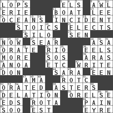 ACROSS 1. Chops off 5. Raised railways 8. Leather borer 11. 4th largest of the Great Lakes 12. Water vessel 13. Area sheltered from the wind 14. Seas 17. Event 19. Unemotional ones 21. Chooses 22. Grain storage tower 23. Elected rep. 24. At this time 27. Burn superficially 29. White ___ sheet 32. Declaim 34. _ de Janeiro 36. Snakelike fish 37. Greater amount 38. Mayday 39. Caspian sea tributary 40. Small Philippine buffalo 41. And so on (abbr.) 42. Compose 43. Spanish title 44. "Two Mules for Sister ____" 46. Car or cant ending 47. Nanny (var.) 50. College mil. group 52. Spoke pompously 55. Michaelmas daisies 57. Accusation by an informer 59. Threatening words 62. Begley and Asner 63. Roll call or roster of names 64. Ache 65. "Barney Miller" actor Jack 66. Eastern Standard Time (abbr.) 67. Jane of fiction DOWN 1. Lion 2. The grampus (Milton) 3. Sliced desserts 4. Theater features 5. Period of immesurable duration 6. Shoestrings 7. Vertical member of a panel or frame 8. Actor Baldwin 9. Gone 10. Allows 12. Twice 15. Annoying sound 16. Filth; sediment 18. Lair 20. Unrefined 24. Roamer 25. U. of Maine site 26. Make _____ (do battle with) 28. Disturbances 29. Nest on high 30. Chalkboard 31. NE Netherlands city 33. Beverage made from leaves 35. Motion picture awards 36. Hearing organ 42. Wetness 45. Printing process, for short 47. "One Day ___ Time" 48. Distance measurement (Brit.) 49. Goodbye (Sp.) 51. Streamer paper 52. Lyric poems 53. Redecorate 54. In addition 55. Santa ___, CA 56. Kill 58. Baseball player Mel 60. Title for a knight 61. Compass dir.