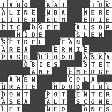 ACROSS 1. Pacific island yam 5. Krazy ___ of comics 8. Pull behind 11. Place in a line 13. Basketball assoc. 14. Past tense of be (plural) 15. 61 cubic inches 16. Shade tree 17. 4th largest of the Great Lakes 18. And so on (abbr.) 19. Double curve, resembling the letter S 21. Columnist Joseph or Stewart 22. Flintstone garb 24. Small, secluded valley 25. A glass for beer 27. Air blower 29. Type of rug 30. Bert's buddy 32. Romantic infatuation 33. Vital fluid 35. "____ silly question..." 39. Off-Broadway awards 41. Proofreading order 42. One (Scot) 43. Develop 45. So be it 48. Root beer relative 49. A salt of uric acid 50. Parka part 52. Three (prefix) 55. Do not 56. Cooking vessel 57. Keyboard key 59. Toward the sea 60. The first octave above the treble staff 61. Biscuitlike quick bread 62. Allow 63. Modern: prefix 64. Washington bills DOWN 1. Story 2. Came down and settled, as after flight 3. Actors Guy, Robert Welles, and Clint 4. Single 5. Leg joint 6. Competent 7. Scottish cap 8. Laconic 9. Greek mythologigal hunter 10. Shed a tear 12. Wear away 14. Water source 20. Set 21. Hindu god of fire 23. Potato state 25. Plant excrement 26. Period 27. Away 28. Plus 30. Greek goddess of the dawn 31. Artist's stand 33. Storage container 34. Area sheltered from the wind 36. Ski resort town in Vermont 37. Cask 38. Had dinner 40. Object of repulsion 43. Environmental prefix 44. Methods 45. Came up 46. French painter Edouard 47. Singer James 49. Hereditary estate 50. Opening into or through something 51. Von Bismarck 53. French philosopher Descartes 54. Angers 56. Baking dish 58. Non-commissioned officer (abbr.)