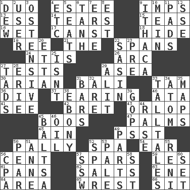 ACROSS 1. Superhero pair 4. First name in cosmetics 9. Naughty children 13. Double-curved letter 14. Pulls into pieces 15. Afternoon social gatherings 16. Dripping 17. 2nd pers. sing. pres. of can (arch.) 18. Flintstone garb 19. Portuguese money of account (variant) 21. Definite Article 22. Connects, as a bridge 24. Nuclear Threat Initiatives 26. Curve 27. Trials 29. At sea 30. Believer in; advocate of (suffix) 31. Indonesian resort city 33. Scottish cap 36. HTML Container Element 37. Rending 40. _ moment's notice (2 wds.) 41. Observe 42. Cy Young winner Saberhagen 43. Fourth or lowest deck 45. Scornful sounds 47. Insides of hands 48. The 18th letter of the Arabic alphabet 49. Inconspicuous attention getter 50. Friendly 52. Health resort 54. Ewer handle 56. Penny 57. Practice fights 59. French article 61. Zero-star reviews 62. Table seasonings 63. Compass dir. 64. Type of rug 65. Take or capture by force 66. Be seated DOWN 1. Morning condensation 2. One who uses or employs something 3. Clearly or manifestly demonstrative 4. And so on (abbr.) 5. Theater features 6. Hyperbolic tangent 7. Celtic language 8. Eastern Standard Time (abbr.) 9. New York city 10. Count _ (2 wds.) 11. Groovy apts. 12. Compass dir. 20. Singer James 22. Indian antelope 23. Before (prefix) 25. Is not 27. Bits 28. One of the Great Lakes 29. Came down and settled, as after flight 31. Taverns 32. "We ___ not amused" (Victoria) 33. Baron Munchausen's specialties 34. Smallest unit of an element 35. Atlas contents 38. Dark wood 39. Republicans 44. Raze (variant) 45. Greek mezzo-soprano Agnes 46. Petroleum 49. Components 50. Lightbulb-shaped fruit 51. Singer Murray 52. Practice fight 53. Diluted with white 55. Painter Guido (1575-1642) 56. Numbers guy (abbr.) 57. Compass dir. 58. Fast jet (abbr.) 60. Arrange properly for use