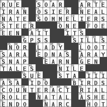 ACROSS 1. Regret 4. Fly high 8. Johnson of "Laugh-In" 12. SW Asia republic 14. Flexible twig of a willow tree 16. Actress Patricia 17. Nathan's nickname 18. Wine waiters 20. Navigate 22. Single 23. Enemy 24. Car or cant ending 25. Small island 28. ___ a Wonderful Life 30. Global Positioning Systems (abbr.) 31. Beverly of Met fame 35. And not 37. Kenny Rogers chart-topper in '80 40. Spoils 41. "Two Mules for Sister ____" 42. Ferber et al. 44. Like ___ of sunshine 45. Fastener 46. Merit 47. Commissioned mil. rank 48. Stories 50. The longest river in the world 52. Institute legal proceedings 54. R.R. building 55. One more than two 58. White ___ sheet 61. Wedding promise 63. Avian creatures 65. Frustrate 70. Monetary unit of Yemen 71. Hero or heavy, e.g. 72. Brizilian seaport 73. American tennis player Robert 74. Inside; within (prefix) 75. Drug cop 76. Being at a high temperature DOWN 1. Wash lightly 2. A salt of uric acid 3. Ingested 4. Mayday 5. Bear (Spanish) 6. Direct toward a target or goal 7. San ____ (Riviera town) 8. Black tropical American cuckoo 9. Coral collection 10. Pacific island yam 11. Otherwise 13. Born 15. Painter Guido (1575-1642) 19. Allows 21. Strike 26. Capri or Wright 27. Sadhe (variant) 29. Fodder prepared in a silo 30. Raisin fruits 32. Old wives' tales, e.g. 33. Grant temporary use of 34. Filthy place 35. Nanny 36. Of the mouth 38. Heredity factor (abbr.) 39. Entertaining tales 41. Fast jet (abbr.) 43. In a ____ (agitated or irritated) 49. Set or collection 51. Experiment locale 53. Genesis locale 55. From or relating to Ireland 56. Potato state 57. Small island 58. 43,560 square feet 59. Within a short period 60. Old (Scot.) 62. Northwest Algerian city 64. Lyricist Gershwin 66. Modern: prefix 67. "One Day ___ Time" 68. 4-wheeled motor vehicle 69. Affectionate concern, for short
