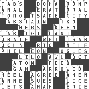 ACROSS 1. Bar bills 5. Capital of the state of Qatar 9. Play 13. Of or related to the anus 14. Part of Q.E.F. 15. Spoken 16. "Corrida" creature 17. Sadhe (variant) 18. Municipality 19. Choose not to consume 21. Ring climax 22. Possessive pronoun 23. Peachy ____! 24. Experiment locale 27. Small child 28. Patter 29. Declaim 31. Soggy 32. Austrian river, tributary to the Danube 36. Southern CA. univ. 37. _ de Janeiro 38. "Death on the ____" 39. Silvers or Donahue 40. Age 41. Stares at amorously 42. _ and Stitch 44. Leather borer 46. Sep. follower 47. Smallest unit of an element 48. Nourish 50. Separate the seeds from cotton 51. Moved like an arrow 54. The bottom of a shoe or boot 56. Match 58. So be it 60. Queen of England 1702-14 61. Takes to court 62. Louse (plural) 63. Allows 64. Nursemaid 65. One of the Great Lakes DOWN 1. Make lace 2. Small Philippine buffalo 3. Sharp remark 4. Agitate, as a liquid 5. Stop 6. NW Algerian seaport 7. Possessed 8. Had dinner 9. Shooting up abruptly 10. Greek mythologigal hunter 11. Floor protector 12. Travel a route regularly 17. Pacific island yam 20. False hair 21. Nine, plus one 23. Krazy ___ of comics 24. Central Nebraska county 25. Bowlike part 26. Indonesian resort city 28. Corporate head (abbr.) 30. Baron Munchausen's specialties 31. Acquire through effort 33. Grain storage tower 34. Actor Baldwin 35. Remainder 37. Friend of Pooh 40. Shade tree 41. Margarine 43. Electrically charged atom 44. Anew 45. Past tense of be (plural) 47. Rep 49. A sleeping potion; an opiate (poet.) 51. Type of rug 52. Independent ruler or chieftain 53. Tenth: prefix 54. Actor Linden 55. Compass dir. 56. White ___ sheet 57. Chewing product 59. Born