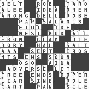 ACROSS 1. Waist strap 5. Director Reiner 8. Edible starchy tuberous root 12. Toward shelter 13. The main thing one is thinking about 15. Sign of something about to happen 16. Amid 18. Small valley 19. Loose flowing garment 20. Infant food 22. Deli grouping 24. Needle holder 26. Binary compound 27. A home for chicks 28. Partially opened flower 29. Everything 32. Inky black, to poets 35. Dollar (slang) 37. Expire 38. Small, narrow, flatbottom fishing boat 39. Actor Linden 40. Table seasoning 41. American Automobile Association (abbr.) 42. Back-to-school mo. 43. Greek god of love 44. Mountains (abbr.) 45. Followers of ems 46. Within a short period 49. Bear (Spanish) 50. Opera by Verdi 51. Contrary to your interests or welfare 55. Allow 56. Family _ (genealogy) 57. Conclusions 59. Drug addict 63. One who doesn't tell the truth 64. Trig term 65. Hero or heavy, e.g. 66. Haul 67. Baking dish 68. Drop; flow; fall DOWN 1. Sound made by sheep 2. Shade tree 3. Lion 4. 3-inch nail 5. To free from 6. Lyric poems 7. Actor Lugosi 8. Singer Mel 9. Mine, in Marseilles 10. Confederate soldiers (slang) 11. Single 14. Plant genus of onion and garlic 17. Yard entry 21. Ichor 23. Say or write further 25. Irritating cutaneous sensations 28. Greek mezzo-soprano Agnes 29. The sixth month of the Jewish calendar 30. _ and Stitch 31. Allows 32. Dutch treat 33. Water vessel 34. Mouths or openings 36. Infant locale 40. Legislators 42. Sounds asleep 45. Compass dir. 47. Petroleum 48. Wrote a lyric poem 49. Unconcealed 51. Operatic vocal solo 52. Letter starter 53. Clip 54. Pulitzer Prize-winning author Ferber 56. Affectionate concern, for short 58. Elected rep. 60. Luau course 61. Pipe bend 62. Portuguese money of account (variant)