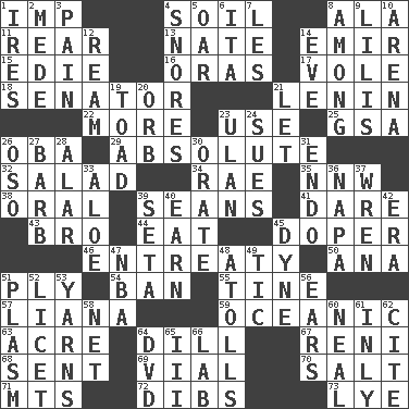 ACROSS 1. Naughty child 4. The visible part of the earth's surface 8. Insect wing 11. Hitchcock's "____ Window" 13. Nathan's nickname 14. Independent ruler or chieftain 15. Singer Brickell 16. Mouths or openings 17. Short-tailed, large-bodied rat 18. Elected representative 21. Soviet premier 1918-24 22. Greater amount 23. Purpose 25. Girls' org. (abbr.) 26. Chief or king in Benin or Nigeria 29. Utter; complete 32. First course 34. Actress Charlotte 35. Compass dir. 38. Spoken 39. Actors Connery and Penn 41. Have the gumption 43. Sis' sibling 44. Consume 45. Drug addict 46. Plea 50. Santa ___, CA 51. Apply oneself diligently 54. Prohibit 55. Prong on a fork 57. Climbing, woody, usually tropical vines 59. Pertaining to the sea 63. 43,560 square feet 64. Deli pickle 67. Painter Guido (1575-1642) 68. Posted 69. Small bottle 70. Table seasoning 71. Mountains (abbr.) 72. Claim 73. Sodium hydroxide DOWN 1. Angers 2. Ancient Persian 3. Ache 4. Sounds asleep 5. Rowing implement 6. Call ___ day 7. French article 8. Amid 9. Ms. Damita and namesakes 10. Sports stadium 12. 480, 500 or 516 sheets of paper 14. First lady 19. Frog relative 20. Globe 21. Allow 23. ____ Bator 24. Takes to court 26. Bear (Spanish) 27. Sharp remark 28. Having or resembling wings 30. Declaim 31. Inside; within (prefix) 33. Medicinal plant 36. California wine valley 37. Songbird 39. Stalk of a moss capsule 40. Merit 42. Epoch 45. Unit of force 47. Basketball assoc. 48. Ringlike coral islands and reefs 49. Nervous spasm 51. Suffix with ecto or cyto 52. It is permitted: Lat. 53. Entertaining tales 56. Hearing organs 58. Fish or hair follower 60. Anneal 61. Inwardly 62. Quote 64. Movie disc 65. One more than two 66. Experiment locale