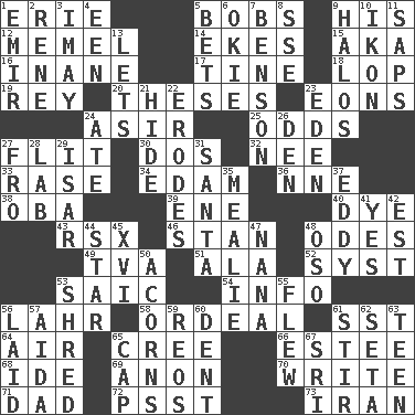 ACROSS 1. One of the Great Lakes 5. Moves up and down 9. Part of HMS, perhaps 12. Klaipeda city 14. Makes supply last 15. Alias (abbr.) 16. Empty; void 17. Prong on a fork 18. Trim (branches) 19. Marina Del _, California 20. College papers 23. Immeasurably long periods of time 24. SW Saudi Arabia district 25. Likelihood 27. Sudden quick movement 30. Two (Sp.) 32. Born 33. Raze (variant) 34. Dutch treat 36. Compass dir. 38. Chief or king in Benin or Nigeria 39. Compass dir. 40. Color 43. Acura sports coupe 46. Comedian Laurel of Laurel & Hardy 48. Lyric poems 49. Federal power corp. 51. Insect wing 52. System (abbr.) 53. Ketch in the Levant 54. A message received and understood 56. Cowardly lion portrayer 58. Severe or trying experience 61. Fast jet (abbr.) 64. Wind 65. Algonquian 66. First name in cosmetics 68. Binary compound 69. At once, immediately (arch.) 70. Compose 71. Male parent 72. Inconspicuous attention getter 73. SW Asia republic DOWN 1. Independent ruler or chieftain 2. French philosopher Descartes 3. "If ____ say so..." 4. Car or cant ending 5. Wagers 6. Migrant worker of the '30s 7. Gillaume's butler role 8. Compass dir. 9. Saint headwear 10. Visual representation of an object 11. Plant excrements 13. Allows 21. Flintstone garb 22. Eats (away) 23. Paradise 24. Had dinner 26. Lair 27. From 28. Experiment locale 29. Austrian river, tributary to the Danube 31. Before Barbara or Clara 35. Ear of corn 37. Whirlpool 41. Consenting reply 42. Eastern Standard Time (abbr.) 44. Play the lead 45. 16 47. Grandmother 48. Bear (Spanish) 50. Oak nuts 53. Tear up 55. Soared 56. Put down 57. Opera by Verdi 59. Vintage cars 60. Scratch 61. Disorderly outburst 62. Stalk of a moss capsule 63. Adolescent 65. Head covering 67. Indian title of respect (Mr.)