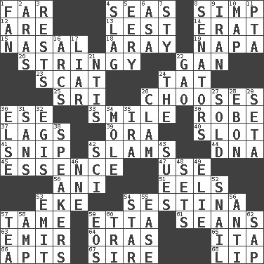 ACROSS 1. At a great distance 4. Oceans 8. Simple or foolish person 12. "We ___ not amused" (Victoria) 13. For fear that 14. Part of Q.E.F. 15. Relating to the nose 18. Like ___ of sunshine 19. California wine valley 20. Slender, wiry 22. Separate the seeds from cotton 23. Go away! 24. Make lace 25. Indian title of respect (Mr.) 26. Opts 30. Compass dir. 33. Grin 36. Loose flowing garment 37. Straggles 39. Mouth or opening 40. Notch 41. Clip 42. Shuts with force 44. Heredity factor (abbr.) 45. Center 47. Purpose 50. Black tropical American cuckoo 51. Snakelike fish 53. Supplement with great effort 54. French poetic form 57. Docile 59. Singer James 61. Actors Connery and Penn 63. Independent ruler or chieftain 64. Mouths or openings 65. Call ___ day 66. Flats, for short 67. Beget 68. Mouth edge DOWN 1. Air blower 2. Ancient river in northeast Turkey 3. Musical pauses 4. Volcanic refuse 5. Suggestive of the supernatural 6. White ___ sheet 7. Filthy place 8. Elected representatives 9. SW Asia republic 10. Atlas unit 11. Parent Teacher Association (abbr.) 16. Curves 17. One who doesn't tell the truth 21. Nuclear Threat Initiatives 22. E Mali city 24. Definite Article 26. Dollar (slang) 27. Disposed of to a purchaser 28. Inky black, to poets 29. Stalk of a moss capsule 30. Otherwise 31. Without 32. Armor plate that protects the chest 34. Undercover agent 35. Lyricist Gershwin 38. Orators 42. _-fi 43. Institutes legal proceedings 46. Compass dir. 48. Puts into a specified state 49. Writer Wiesel 52. Slow-paced one 53. Give off 54. Play the lead 55. Relaxation 56. Against 57. Beverage made from leaves 58. Electrical Unit 59. Greek goddess of the dawn 60. Three (prefix) 62. Plant excrement