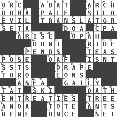 ACROSS 1. The grampus (Milton) 4. Blind as ____ 8. Bowlike part 12. Capital of the state of Qatar 14. Light colored 15. Grain storage tower 16. Morally bad or wrong 17. Interpreter 20. Stalk of a moss capsule 21. ___ good deed 22. Tax preparer (abbr.) 23. Ascend 27. Brightly colored fish 29. Do not 31. Travel on or in a vehicle 34. Hangs 35. Beverages made from leaves 36. Introduce or present, as a question 39. Clumsy lout 41. Is not 42. Fast planes 43. Window treatment 46. "Corrida" creature 47. Immeasurably long periods of time 48. Toward the sea 51. Lightheartedly 54. Make lace 56. What Jean-Claude Killy likes to do 58. Pledge 61. Pleas 66. Relationship diagram 67. Small Philippine buffalo 68. Carryall 69. Pismires 70. French philosopher Descartes 71. Single time 72. Arrange properly for use DOWN 1. Lyric poems 2. Be footloose 3. Riviera of "Kiss of the Spider Woman" 4. Fitting 5. Long, evenly shaped piece 6. Chicken ___ king 7. Look after 8. White ___ sheet 9. Actors Guy, Robert Welles, and Clint 10. Hoof sound 11. Israeli folk dance 13. Having or resembling wings 18. "Barney Miller" actor Jack 19. Pet locale 24. Binary compound 25. Manchild 26. Inside; within (prefix) 28. Nick name for Arthur 30. Sadhe (variant) 32. Daniel's nick name 33. Eastern Standard Time (abbr.) 34. Mexican monetary units 36. Pacific Standard Time (abbr.) 37. Bear (Spanish) 38. Ski resort town in Vermont 40. Tree-dwelling hopper 44. Santa ___, CA 45. Air pressure measure (abbr.) 49. Compass dir. 50. Alias (abbr.) 52. Globular water bottle used in Asia 53. Tall tales 54. Rend 55. Singer Murray 57. "Tell ____ the Marines!" 59. Wig 60. Command 62. Actress Charlotte 63. Electrically charged atom 64. And so on (abbr.) 65. Observe