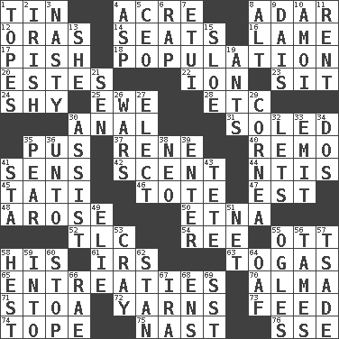 ACROSS 1. Metal container 4. Land measure 8. The sixth month of the Jewish calendar 12. Mouths or openings 14. Theater features 16. Unable to walk 17. Expression of disdain 18. Census information 20. _____ Park, CO 22. Electrically charged atom 23. Be seated 24. Like a shrinking violet 25. She-sheep 28. And so on (abbr.) 30. Of or related to the anus 31. Having a sole or soles 35. Ichor 37. French philosopher Descartes 40. San ____ (Riviera town) 41. Elected reps. 42. Aroma 44. Nuclear Threat Initiatives 45. Jacques of French films 46. Lug 47. Eastern Standard Time (abbr.) 48. Came up 50. Inactive volcano in Sicily 52. Affectionate concern, for short 54. To riddle 55. Baseball player Mel 58. Part of HMS, perhaps 61. Big collection agency 63. Ancient Roman robes 65. Pleas 70. _ mater 71. Portico 72. Tall tales 73. Nourish 74. Drink excessively 75. Political cartoonist Thomas 76. Compass dir. DOWN 1. Drinks excessively 2. From or relating to Ireland 3. Difficult 4. Viper 5. Corporate head (abbr.) 6. Hit sharply and swiftly 7. Needle holder 8. Keyboard modifier key 9. Raised platform 10. Mine, in Marseilles 11. Monthly bill 13. A female animal or person 15. A type of plum 19. Pismires 21. Elected rep. 26. Armed conflicts 27. Choose 29. Pupil covering 30. Aid 32. Allows 33. Give off 34. Two (Sp.) 35. Lightbulb-shaped fruit 36. To (old English) 38. Modern: prefix 39. Keyboard key 41. R.R. building 43. Wig 49. Writer Wiesel 51. Fish or hair follower 53. Supercomputer manufacturer 55. Stares 56. Domesticates 57. Sadhe (variant) 58. Command 59. To the inside or interior of 60. Cease 62. Comedian Laurel of Laurel & Hardy 64. Clumsy lout 66. Actress Charlotte 67. Lyricist Gershwin 68. Followers of ems 69. Fast jet (abbr.)