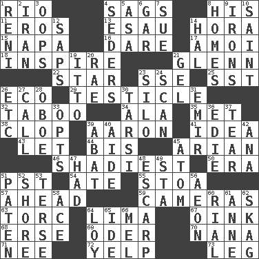 ACROSS 1. _ de Janeiro 4. Droops 8. Part of HMS, perhaps 11. Greek god of love 13. He sold his birthright 14. Israeli folk dance 15. California wine valley 16. Have the gumption 17. Mine, in Marseilles 18. Heighten or intensify 21. American astronaut and politician John 22. Play the lead 23. Compass dir. 25. Fast jet (abbr.) 26. Environmental prefix 29. A testis 32. Off limits 34. Wing 35. Was introduced to 38. Hoof sound 39. Composer Copland 41. The content of cognition 43. Allow 44. Twice 45. Believer in; advocate of (suffix) 46. Most dark, concealed or hidden 50. Period 51. Pacific Standard Time (abbr.) 54. Had dinner 55. Portico 57. At or in the front 59. Devices for capturing images 63. Torque (variant) 64. Pale green bean 67. Pig sound 68. Celtic language 69. River in Europe 70. Nanny 71. Born 72. Sharp bark 73. Part of a journey DOWN 1. Painter Guido (1575-1642) 2. SW Asia republic 3. I made a mistake 4. Spring feasts 5. White ___ sheet 6. Slender fish 7. Institute legal proceedings 8. Dwellings 9. Removes the wrinkles 10. Virtuous person 12. Plant excrements 14. Actor Linden 19. "Tell ____ the Marines!" 20. Actress Charlotte 21. Set 23. Grain storage tower 24. Examine hastily 26. And so on (abbr.) 27. Give a ring to 28. Mitch Miller's instrument 30. Tarsus (plural) 31. Arab leader 33. Elects 36. Singer Brickell 37. Rend 39. Blind as ____ 40. Assistant 42. Santa ___, CA 45. Smallest unit of an element 47. Possessed 48. Fortification 49. R.R. building 51. Eucharist need 52. Dinah or Pauly 53. Laconic 56. Age 58. Adept person 60. Monetary unit of Yemen 61. Singer Murray 62. Heroin 64. Myrna of the movies 65. Binary compound 66. Cartoonist voice _ Blanc