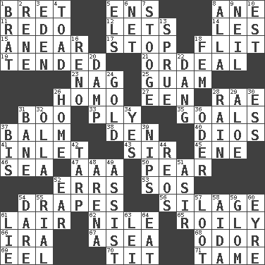 ACROSS 1. Cy Young winner Saberhagen 5. Followers of ems 8. One (Scot) 11. Make new 12. Allows 14. French article 15. Approach 17. Close up, plug up 18. Sudden quick movement 19. Watched over 21. Severe or trying experience 23. Tired old horse 25. Island territory of the United States 26. Like (prefix) 27. Car or cant ending 28. Actress Charlotte 31. Oct. 31 cry 33. Strand of rope, yarn or thread 35. Finish lines 37. Lip ointment 38. Lair 40. "Vaya con ____" 41. An arm off of a larger body of water 43. Title for a knight 45. Compass dir. 46. Ocean 47. Auto club (abbr.) 50. Lightbulb-shaped fruit 52. Blunders 53. Mayday 54. Window treatments 56. Fodder prepared in a silo 61. Den 62. "Death on the ____" 65. Agitated, as a liquid 66. Retirement account (abbr.) 67. At sea 68. Aroma 69. Snakelike fish 70. Teat (slang) 71. Docile DOWN 1. Naughty child 2. French philosopher Descartes 3. Genesis locale 4. Frog relative 5. Raised railways 6. Fish or hair follower 7. Moe Howard, for one 8. Silent film actress Nazimova 9. Famous astronaut Armstrong 10. Eastern Standard Time (abbr.) 13. Disorder 16. Western Nevada city 18. Opposite of masc. 20. Moist 22. Mild oath, euphamism for damn 24. Aureate 26. Residence 28. Precipitation 29. Medicinal plant 30. Double-curved letter 31. Object of repulsion 32. Rounded earthenware pot or jar 34. Consenting reply 36. Baltic tributary 37. Again 39. Pinches, bites 42. Canvas cover 44. Vintage cars 48. Sports stadium 49. Aid 51. SW Saudi Arabia district 52. Ewer handle 54. Have the gumption 55. Monetary unit of Yemen 57. Spoils 58. Opera by Verdi 59. Take by theft 60. Jane of fiction 61. Falsehood 63. Luau accessory 64. Ingest