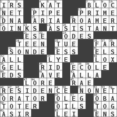 ACROSS 1. Big collection agency 4. Krazy ___ of comics 7. Alliance 11. Fish or hair follower 12. Corncob 13. First class 14. Heredity factor (abbr.) 15. Operatic vocal solo 16. Wanderer 17. Pig sounds 19. Helper 21. Compass dir. 23. Lyric poems 24. Adolescent 25. Third day of the wk. 26. Distant 29. Message 30. Curvy letter 31. Raised railways 32. Everything 33. Sodium hydroxide 34. Brine-cured salmon 35. Set 36. To free from 37. Learning spot: Fr. 40. Begley and Asner 41. "___ Maria" 42. Silent film actress Nazimova 43. Old wives' tales, e.g. 45. Actress Charlotte 46. Dwelling 51. Music written for nine 55. Speaker 56. Cassini of fashion 58. Chief or king in Benin or Nigeria 59. Carrier 60. Lubricates 61. Coat; cloak 62. SW Saudi Arabia district 63. Luau accessory 64. Followers of ems DOWN 1. _ china 2. Painter Guido (1575-1642) 3. Comedian Laurel of Laurel & Hardy 4. Apertif with cassis 5. Capital of Western Samoa 6. Afternoon social gatherings 7. Naughty children 8. Pale green bean 9. Sign of things to come 10. An absolute certainty 12. Went by 13. Airs 16. Amusement-park features 18. Peachy ____! 20. Lush 22. Compass dir. 24. For Whom the Bell _____ 25. Miss Universe 1986, Barbara Palacios _ 26. Chap (slang) 27. _ vera 28. Acura sports coupe 29. Downhill vehicle 32. Grow older 33. Make or become more lively 36. More valued for its uncommonness 37. Hearing organ 38. Rings like a ship's bell 39. Margarine 43. 61 cubic inches 44. Scent 46. Roll call or roster of names 47. Greek god of love 48. Suttee (variant) 49. Calm and collected 50. Writer Wiesel 52. Musical sound 53. Inky black, to poets 54. Labels 57. Connecticut Ivy Leaguer