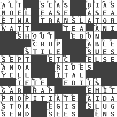 ACROSS 1. The first octave above the treble staff 4. Oceans 8. Prejudice 12. Christmas carol 14. Comfort 15. At sea 16. Inactive volcano in Sicily 17. Interpreter 20. Electrical Unit 21. Afternoon social gathering 22. Cuckoo 23. Yell 27. Inky black, to poets 29. Riding implement 31. Competent 34. Vertical member of a panel or frame 35. Takes to court 36. Back-to-school mo. 39. And so on (abbr.) 41. Otherwise 42. Small Philippine buffalo 43. Amusement-park features 46. Shout 47. Slanted text style (abbr.) 48. Wig 51. Prepares for publication 54. Slender fish 56. Strike 58. Give off 61. Appease 66. Opera by Verdi 67. Portico 68. The front part of a cuirass 69. A hard, heavy blow 70. Post 71. Perceives with the eye 72. Followers of ems DOWN 1. Afresh 2. Globular water bottle used in Asia 3. Portable shelters 4. Put into a specified state 5. Hearing organ 6. White ___ sheet 7. Emitted 8. Sound made by sheep 9. Byzantium, centuries later 10. Period of immesurable duration 11. Indian skirt 13. Thin strip of wood or metal 18. Perceive with the eye 19. Experiment locale 24. Sep. follower 25. RI univ. 26. Lacquered or enameled metalware 28. Fertile tracts in a desert 30. _ dish (used to culture cells) 32. French article 33. Compass dir. 34. Lacking originality or spontaneity 36. Declare 37. Compass dir. 38. Characterized by complete cowardliness 40. Quote 44. Male parent 45. Biblical high priest 49. Three (prefix) 50. Consume 52. Afternoon social gatherings 53. Grin 54. Global Positioning Systems (abbr.) 55. Johnson of "Laugh-In" 57. Sliced desserts 59. Goddess of spring and wife of Bragi 60. Labels 62. Writing tablet 63. Ripen 64. Neckwear 65. Double-curved letter