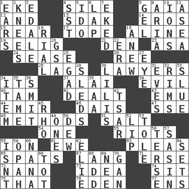 ACROSS 1. Make supply last 4. Drop; flow; fall 8. Greek goddess of the earth (variant) 12. Also 13. Neighbor of Neb. 14. Greek god of love 15. Located in or toward the back 17. Drink excessively 18. Place in a line 19. Major League Baseball Commissioner Bud 21. Lair 23. White ___ sheet 24. Gospel singer Marvin 26. To riddle 28. Straggles 30. Those who practice law 34. ___ a Wonderful Life 37. Jai _ 39. Tending to cause great harm 40. Scottish cap 41. Started a card game 43. Australian flightless bird 44. Independent ruler or chieftain 46. Raised platform 47. Compass dir. 48. Modes 51. Table seasoning 54. Single 55. Disturbances 58. Electrically charged atom 61. She-sheep 63. Entreaties 65. Arguments over trivial matters 67. Long (Scottish) 71. Celtic language 72. Billionth: prefix 73. The content of cognition 74. Be seated 75. Not this but _ 76. Paradise 77. Followers of ems DOWN 1. Hearing organs 2. Leg joints 3. Peak District village in England 4. Fast jet (abbr.) 5. Wedding promise 6. Pet locale 7. Supplemented with great effort 8. Set 9. Operatic vocal solo 10. Charged atoms 11. Toward the sea 16. Monetary unit of Yemen 18. Afresh 20. Girls' org. (abbr.) 22. Epoch 25. Mild oath 27. Sight organ 29. Bobsleighs 30. Ms. Damita and namesakes 31. Nights before holidays 32. Basketball hoops 33. Change direction abruptly 34. Detail 35. Docile 36. Stricken, poetically 38. Auto club (abbr.) 42. Russian ruler of old 45. 17th letter of the Greek alphabet 49. Singles 50. Morning condensation 52. Mouth edge 53. Lacquered or enameled metalware 56. Laconic 57. Indian antelope 58. Is not 59. Brightly colored fish 60. Nanny 62. Writer Wiesel 64. Arranges properly for use 66. Small child 68. Say or write further 69. Born 70. Separate the seeds from cotton
