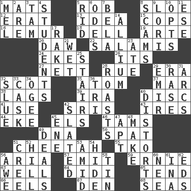 ACROSS 1. Floor coverings 5. Director Reiner 8. A type of plum 12. Part of Q.E.F. 13. The content of cognition 15. 911 reaches them 16. Arboreal primate 18. Small valley 19. Johnson of "Laugh-In" 20. Fool 22. Deli grouping 24. Supplements with great effort 26. ___ a Wonderful Life 27. Remaining after all deductions 28. Regret 29. Epoch 32. Highlander 35. Smallest unit of an element 37. Make imperfect 38. Falls behind 39. Retirement account (abbr.) 40. Compact _ 41. Purpose 42. Indian titles of respect 43. Angers 44. Make supply last 45. Raised railways 46. Scottish caps 49. Heredity factor (abbr.) 50. Petty quarrel 51. Leopard's kin 55. Ring climax 56. Roberta Peters solo 57. Send forth 59. Bert's buddy 63. Water source 64. "You Light Up My Life" star Conn 65. Be inclined (to) 66. Snakelike fish 67. Lair 68. Oceans DOWN 1. Cartoonist voice _ Blanc 2. "We ___ not amused" (Victoria) 3. Scottish cap 4. SAT takers 5. To free from 6. Lyric poems 7. Actor Lugosi 8. Fraudulent business schemes 9. Australian parrot (variant) 10. Chooses 11. Compass dir. 14. Plant genus of onion and garlic 17. Libertine 21. Dripping 23. Had dinner 25. Flight of steps 28. Cooks with dry heat, as in an oven 29. Independent ruler or chieftain 30. Raze (variant) 31. Curves 32. Change direction abruptly 33. Keg 34. Double curve, resembling the letter S 36. Three (prefix) 40. What propaganda does 42. Scheduled 45. Compass dir. 47. Fitting 48. Cause to be 49. Allots cards 51. Algonquian 52. Land elevation 53. Among 54. Flintstone garb 56. Deep reverence 58. Shallow baking pan 60. Born 61. _ tizzy (2 wds.) 62. Begley and Asner