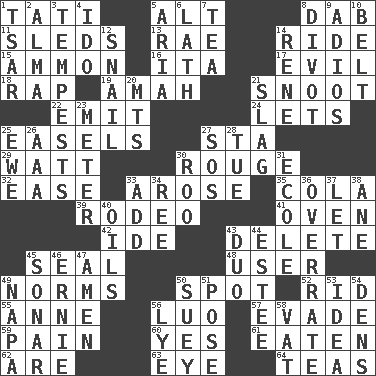 ACROSS 1. Jacques of French films 5. Keyboard modifier key 8. Pat or tap gently 11. Bobsleighs 13. Actress Charlotte 14. Travel on an animal 15. ID or VA city 16. Call ___ day 17. Tending to cause great harm 18. Hit sharply and swiftly 19. Nursemaid 21. Snout, nose 22. Send forth 24. Allows 25. Artist's stands 27. R.R. building 29. Electrical Unit 30. Makeup applied to the cheeks 32. Comfort 33. Came up 35. Root beer relative 39. Cowboy competition 41. Baking chamber 42. Binary compound 43. Erase 45. Lick closed 48. One who uses or employs something 49. Typical models 50. Blemish 52. To free from 55. Singer Murray 56. Nilotic language 57. Elude 59. Ache 60. It is so 61. Eroded 62. "We ___ not amused" (Victoria) 63. Sight organ 64. Beverages made from leaves DOWN 1. Russian ruler of old 2. _ mater 3. Storms 4. Wedding promise 5. Roberta Peters solo 6. Thin strip of wood or metal 7. Beverage made from leaves 8. A piece of turf (Scot.) 9. Goodbye (Sp.) 10. Waist strap 12. Slow-paced one 14. French philosopher Descartes 20. Mountains (abbr.) 21. Volcanic refuse 23. Distance measurement 25. She-sheep 26. Auto club (abbr.) 27. Mayday 28. Third day of the wk. 30. Friend of Pooh 31. Learning spot: Fr. 33. Increase 34. To riddle 36. Make much ado about nothing 37. Allow 38. One (Scot) 40. Petroleums 43. Superhero pair 44. First name in cosmetics 45. Underwater navigation system 46. Bert's buddy 47. So be it 49. California wine valley 50. Chop _ 51. Airs 53. The content of cognition 54. Hiding places for outlaws 56. Sodium hydroxide 58. Large container