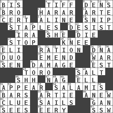 ACROSS 1. Twice 4. Small quarrel 8. Habitations of wild animals 12. Sis' sibling 13. Ethiopian city, capital of Harari 14. Johnson of "Laugh-In" 15. Sure thing 17. Place in a line 18. Clip 19. Paper fasteners 21. Stop 23. Retirement account (abbr.) 24. A female animal or person 26. Pass on 27. Constrict 28. Leg joint 30. Biblical high priest 31. Food allowance for one day 34. Heredity factor (abbr.) 37. Superhero pair 38. Make improvements or corrections to 39. Armed conflict 40. Elected rep. 41. Break 42. Eastern Standard Time (abbr.) 43. "Corrida" creature 44. Table seasoning 46. Quiet! 47. Tired old horse 50. Pipe bend 51. Seem 54. Deli grouping 57. Taverns 58. Nick name for Arthur 60. Afresh 62. A slight indication 63. Moves on water 64. Separate the seeds from cotton 65. Perceives with the eye 66. Suggestive of the supernatural 67. Compass dir. DOWN 1. English channel? 2. Angers 3. Casting lots 4. Falsehoods 5. From or relating to Ireland 6. Air blower 7. Flintstone 8. Hyrax 9. Bert's buddy 10. Nuclear Threat Initiatives 11. Back-to-school mo. 13. Actor Linden 16. Pacific island yam 20. Infant food 22. Genesis locale 25. Supplementing with great effort 27. Change direction abruptly 29. Thickened enlargement 30. Begley and Asner 31. Bring up, as a child 32. ID or VA city 33. Afternoon social gathering 34. Residences 35. Political cartoonist Thomas 36. Tate display 41. Capital of the state of Qatar 43. College papers 44. Ocean 45. _ mater 46. Disorder 48. Moving about 49. Lightheartedly 51. Lettered men learn these first 52. Light colored 53. Raze (variant) 55. French article 56. Oceans 59. Actress Charlotte 61. Compass dir.