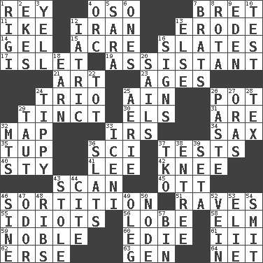 ACROSS 1. Marina Del _, California 4. Bear (Spanish) 7. Cy Young winner Saberhagen 11. Mamie's husband 12. SW Asia republic 13. Eat (away) 14. Set 15. Land measure 16. Chalkboards 17. Small island 19. Aide 21. Tate display 23. Matures 24. Musical group of three 25. The 18th letter of the Arabic alphabet 26. Cooking vessel 29. A color or tint 30. Raised railways 31. "We ___ not amused" (Victoria) 32. Atlas unit 33. Big collection agency 34. Saxophone 35. Uncastrated adult male sheep 36. _-fi 37. Trials 40. Filthy place 41. Area sheltered from the wind 42. Leg joint 43. Examine minutely or intensely 45. Baseball player Mel 46. Conclusion 51. All-night dance parties 55. Foolish or stupid persons 56. Ear part 58. Shade tree 59. Having high moral qualities 60. Singer Brickell 61. One more than two 62. Celtic language 63. Commissioned mil. rank 64. Fish or hair follower DOWN 1. Swiss mountan, "Queen of the Mountains" 2. Supplements with great effort 3. Shout 4. The grampus (Milton) 5. "Two Mules for Sister ____" 6. Singles 7. Naughty children 8. Roll call or roster of names 9. Paradise 10. Trial 12. Of or pertaining to medicine 13. Otherwise 16. Signals 18. Merit 20. Travel by water 22. Small child 24. Likely to tip or tilt 25. Nest on high 26. Thick mixture 27. Mouths or openings 28. John Ritter's dad 29. Pulled tight 32. Mountains (abbr.) 33. Ancient Celtic tribe of eastern Britain 36. Narrow boards 37. Ring climax 38. Main course 39. Bristle 43. Took without asking 44. Quote 46. Trig term 47. Scent 48. Chest bones 49. Cassini of fashion 50. Connecting point 52. Distinctive style or manner 53. Writer Wiesel 54. Stricken, poetically 57. Storage container