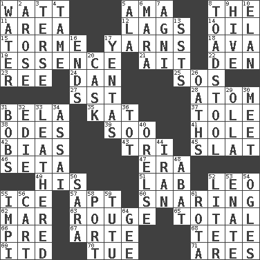 ACROSS 1. Electrical Unit 5. Nursemaid (var.) 8. Definite Article 11. Type of rug 12. Falls behind 14. Petroleum 15. Singer Mel 17. Entertaining tales 18. Actress Gardner 19. Substance 21. Small island 22. Lair 23. To separate or throw off 24. Daniel's nick name 25. Distress signal 27. Fast jet (abbr.) 28. Tiny particle 31. Actor Lugosi 35. Krazy ___ of comics 37. Lacquered or enameled metalware 38. Lyric poems 39. "Barney Miller" actor Jack 41. Opening into or through something 42. Prejudice 43. Three (prefix) 45. Narrow board 46. Bristle 47. Period 49. Part of HMS, perhaps 51. Experiment locale 52. Lion 55. Frozen water 57. Fitting 60. Catching in a trap 62. Make imperfect 63. Makeup applied to the cheeks 65. "_____ Recall" 66. Before (prefix) 67. Johnson of "Laugh-In" 68. Wig 69. It would 70. Third day of the wk. 71. Ancient Greek god of war DOWN 1. Wetness 2. Came up 3. Laconic 4. Not wild 5. Chicken ___ king 6. Hindu Mythology: god of death 7. Hindu god of fire 8. Inedible or poisonous agaric 9. Hub of activity 10. Liveliness 13. Fast planes 16. Extremities 17. Gossips 20. Keg 26. Profane or obscene expressions 29. Water jar 30. Rendezvous 31. Moves up and down 32. Singer Brickell 33. Tough but pliablecoriaceous 34. Slender Brazilian palm 36. Small child 40. Threatening words 44. SW Asia republic 48. Blind as ____ 50. "Two Mules for Sister ____" 52. 61 cubic inches 53. Related on the mother's side 54. Stares at amorously 55. Body of Kaffir warriors 56. Haul 58. Left side of a ship or aircraft 59. Ballerina skirt 61. Roll call or roster of names 64. Unit of force equal to gravity