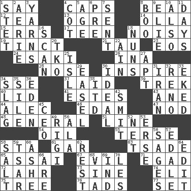 ACROSS 1. Declare 4. Smile enhancers 8. Necklace unit 12. Afternoon social gathering 13. Legendary monster 14. Rounded earthenware pot or jar 15. Blunders 17. Adolescent 18. Annoyingly loud 19. Tinged 21. The 19th letter of the Greek alphabet 23. Greek goddess of the dawn 24. 1973 Nobel Price Winner (Physics) Leo 26. _ tizzy (2 wds.) 28. Olfactory organ 30. Motivate 34. Compass dir. 37. Put down 39. Long journey 40. Hat (slang) 41. _____ Park, CO 43. A saturated hydrocarbon 44. Actor Baldwin 46. Dutch treat 47. Allow head to fall sleepily 48. Commissioned military rank 51. Actor's bit 54. Lubricate 55. Laconic 58. R.R. building 61. Slender fish 63. Sadhe (variant) 65. Slender Brazilian palm 67. Tending to cause great harm 71. Mild oath 72. Cowardly lion portrayer 73. Trig term 74. Connecticut Ivy Leaguer 75. Woody plant 76. Small boys 77. Arrange properly for use DOWN 1. Proofreading order 2. Nest on high 3. Tall tales 4. Small bed 5. Personal question 6. Before (prefix) 7. Transmitted 8. Oct. 31 cry 9. Writer Wiesel 10. In addition 11. 24-hour periods 16. Skim 18. Religious women 20. Ring climax 22. The 18th letter of the Arabic alphabet 25. Small island 27. Fitting 29. Artist's stand 30. Standard of perfection 31. SW Asia republic 32. Western Nevada city 33. Made supply last 34. Volcanic refuse 35. Drop; flow; fall 36. Paradise 38. It would 42. Stricken, poetically 45. Corporate head (abbr.) 49. Swiss mountan, "Queen of the Mountains" 50. Wing 52. Fish or hair follower 53. Celtic language 56. Gurus 57. Peak District village in England 58. Table seasoning 59. Russian ruler of old 60. American tennis player Robert 62. State of inaction 64. Prepare for publication 66. "We ___ not amused" (Victoria) 68. By way of 69. Indiana (abbr.) 70. French article